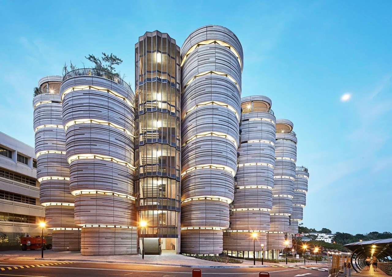 Diseñado por el estudio de Heatherwick y ejecutado por el arquitecto líder de CPG Consultores, este edificio de usos múltiples es una referencia de educació para más de 33 mil estudiantes de Singapour. Adecuado a las formas contemporáneas de aprendizaje, el NTU Learning Hub, está compuesto por doce torres, cada una una pila de salas redondeadas, que se estrechan hacia adentro, alrededor de un atrio central, para proporcionar 56 habitaciones sin esquinas.