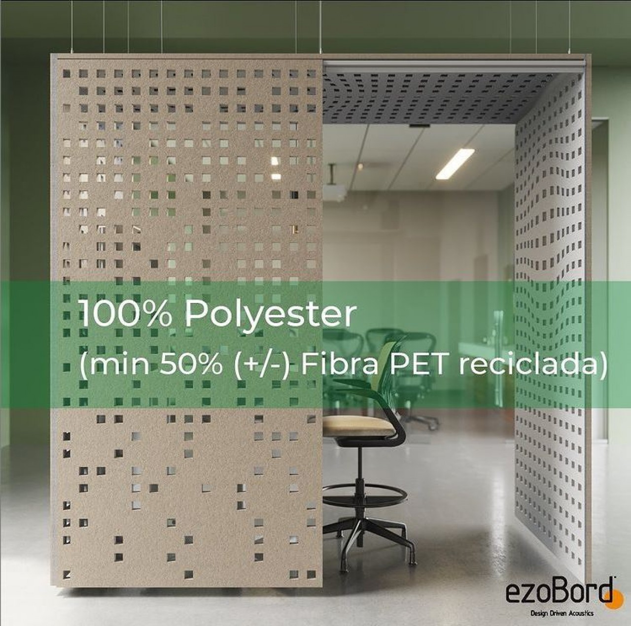 Los paneles ezoBord están hechos de fibra de PET 100% de la cual +/- 50% se deriva de botellas de agua de plástico recicladas. La producción de ezoBord es un proceso notablemente limpio y ecológico, lo que resulta en un bajo consumo de energía, sin emisiones, sin gases o COV, sin aguas residuales y sin requerir el uso de adhesivos. Todo el material de desecho es 100% reciclable y se vuelve a poner en el proceso de fabricación para crear nueva fibra. Prácticamente no hay desperdicio en la producción.