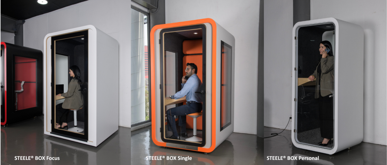 STEELE® Focus, STEELE® BOX Single y STEELE® BOX Personal: pensadas para una persona, funcionan muy bien para videollamadas, trabajo profundo o momentos en los que alguien necesita aislarse un rato del entorno abierto.