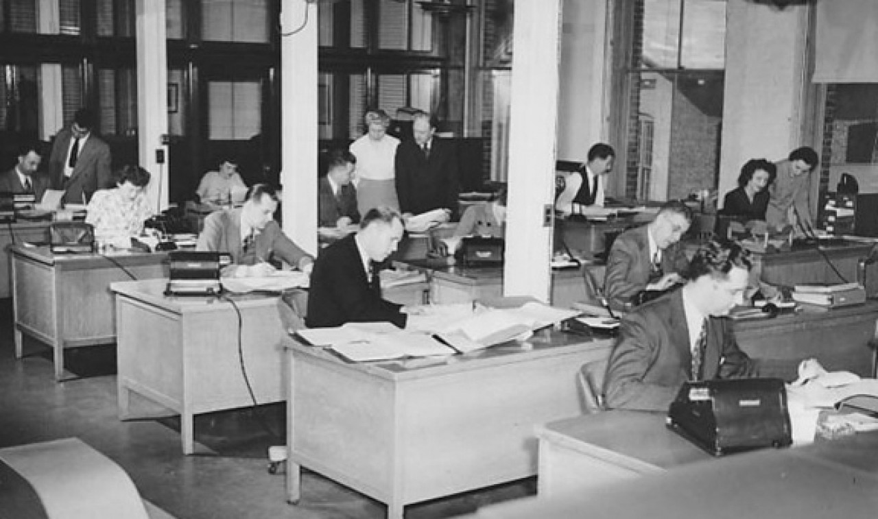 Cubículos, jerarquías y desorden. Las jerarquías verticales regían la distribución de espacios. Pequeños cubículos y oficinas privadas eran el centro de operación dentro de áreas oscuras con estanterías, papeles y archivos por todos lados. Surge el concepto de mobiliario modular, específicamente para uso en oficinas.
