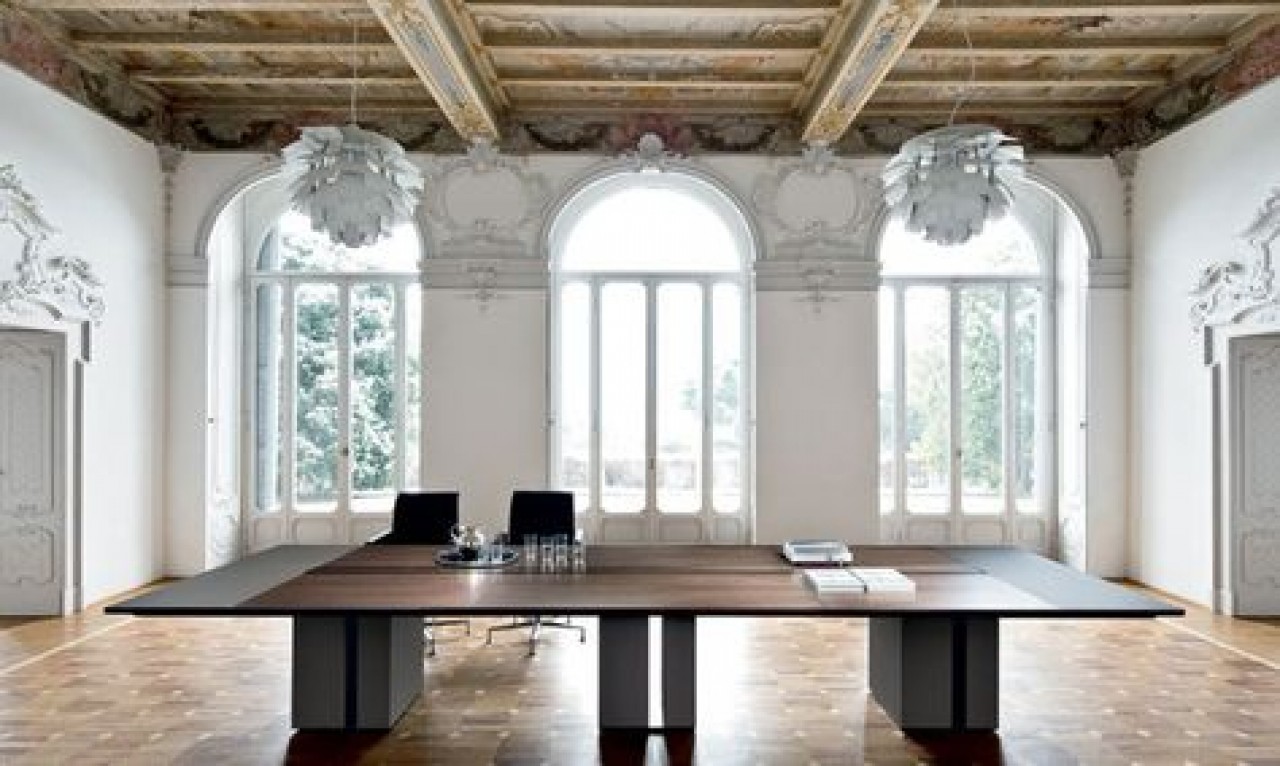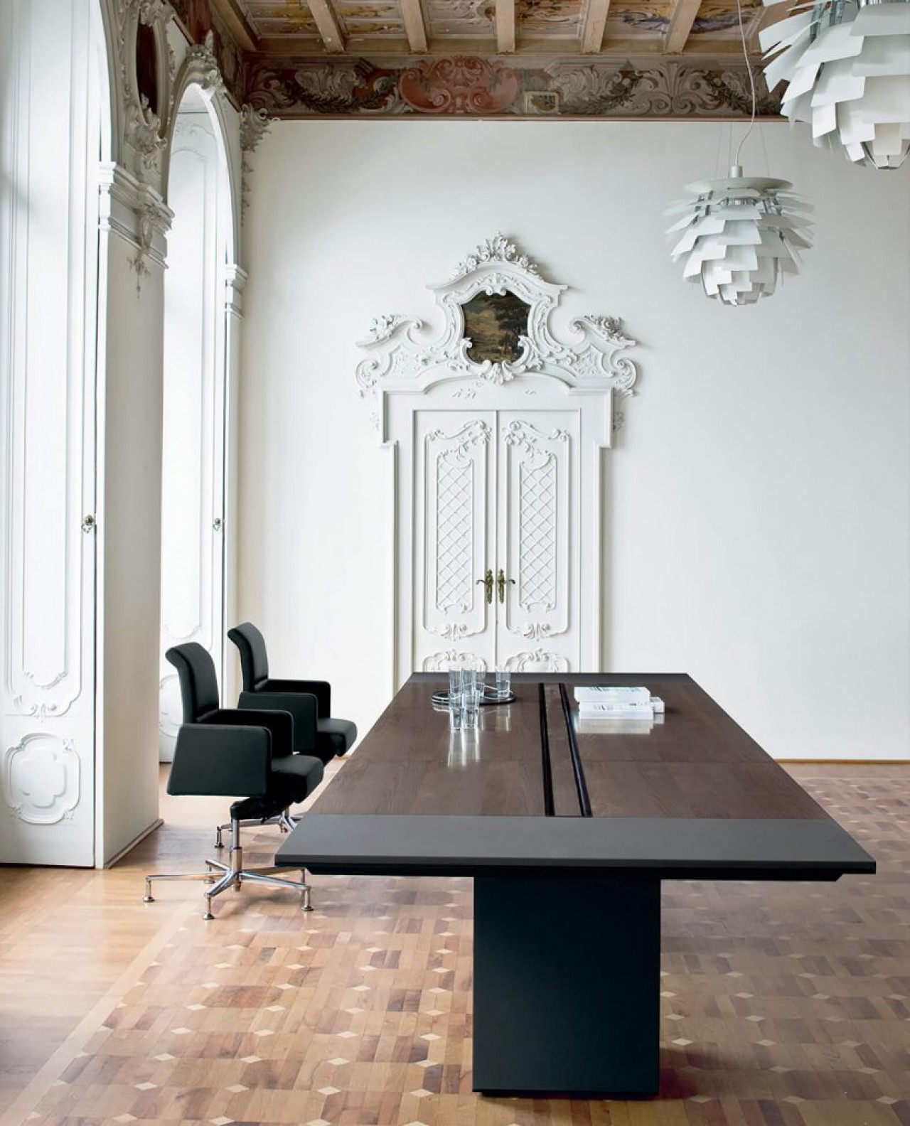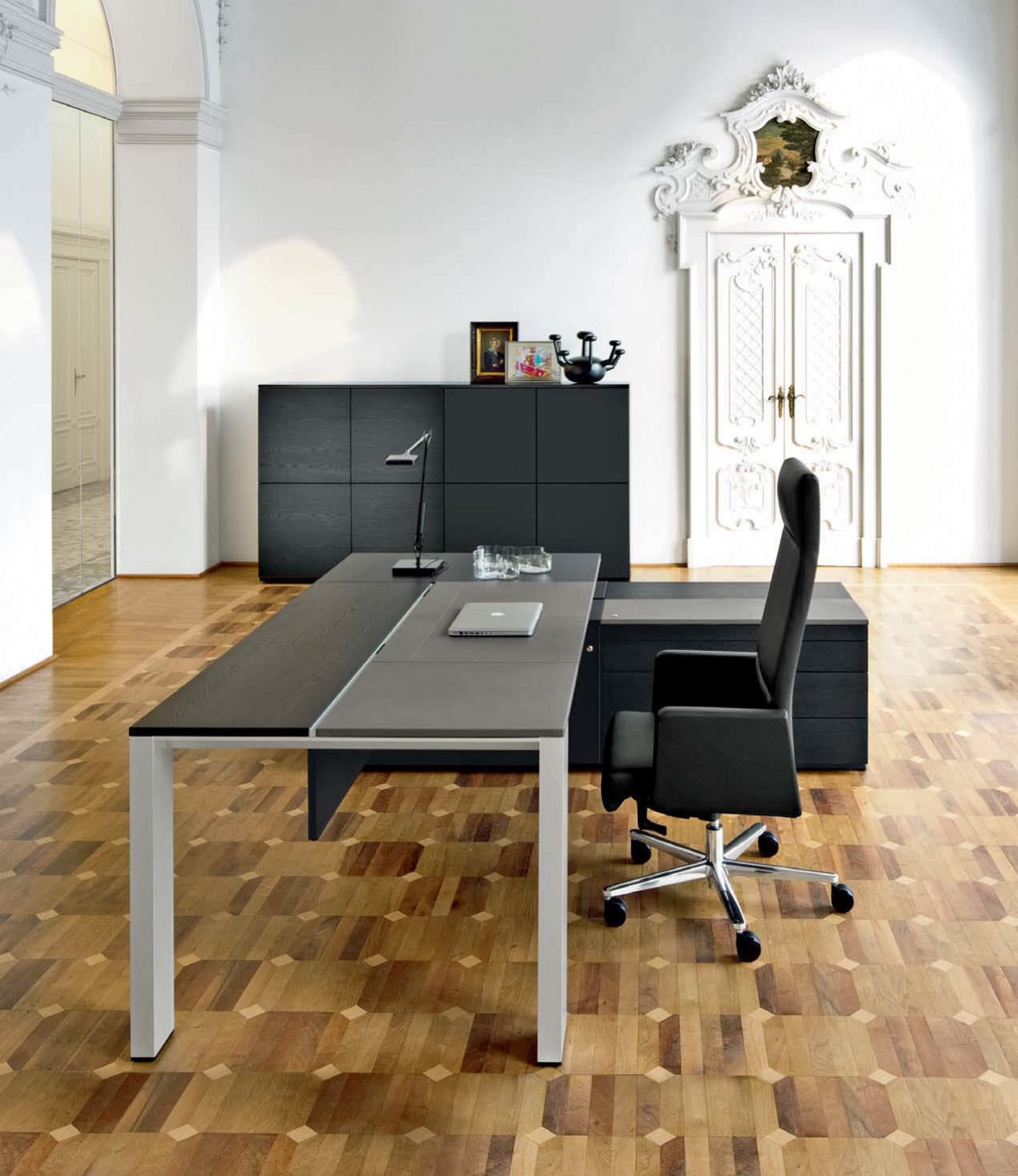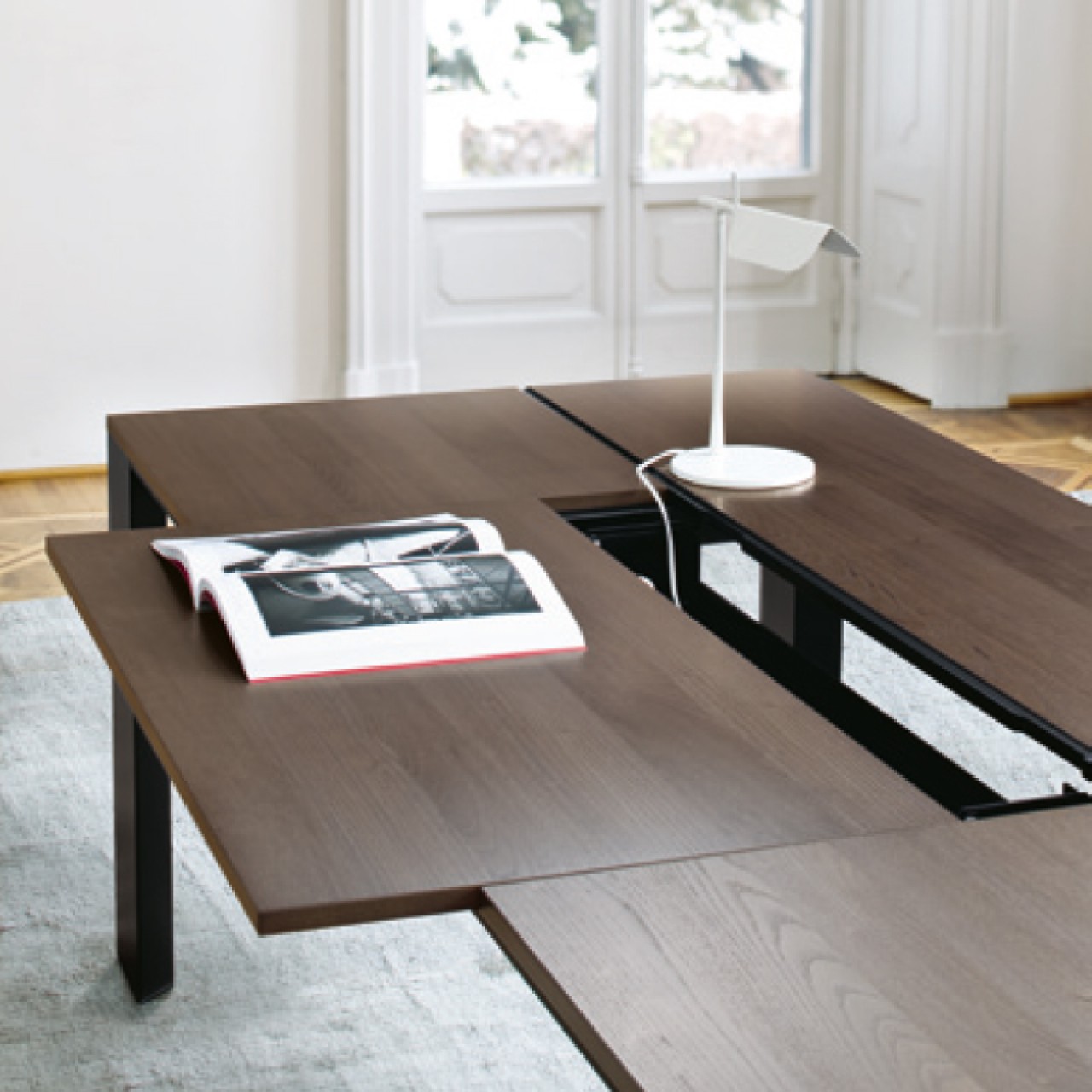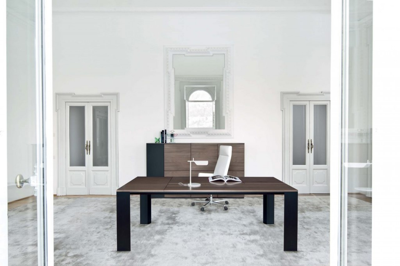 Las importantes dimensiones, con encimeras de hasta 240 cm, lo convierten en un símbolo de liderazgo. Una tapa de madera delgada descansa sobre un marco resistente oculto por un marco perimetral de aluminio. El particular rebaje estético del perfil del escritorio facilita la colocación del asiento con reposabrazos junto a la encimera. La tapa corredera es la solución adecuada para mantener la superficie de trabajo en orden y estar conectada al mismo tiempo. La apertura de la parte superior permite el acceso a los enchufes eléctricos ubicados en la bandeja de cableado debajo. El mecanismo de apertura está equipado con un dispositivo de bloqueo de seguridad para abrir y cerrar