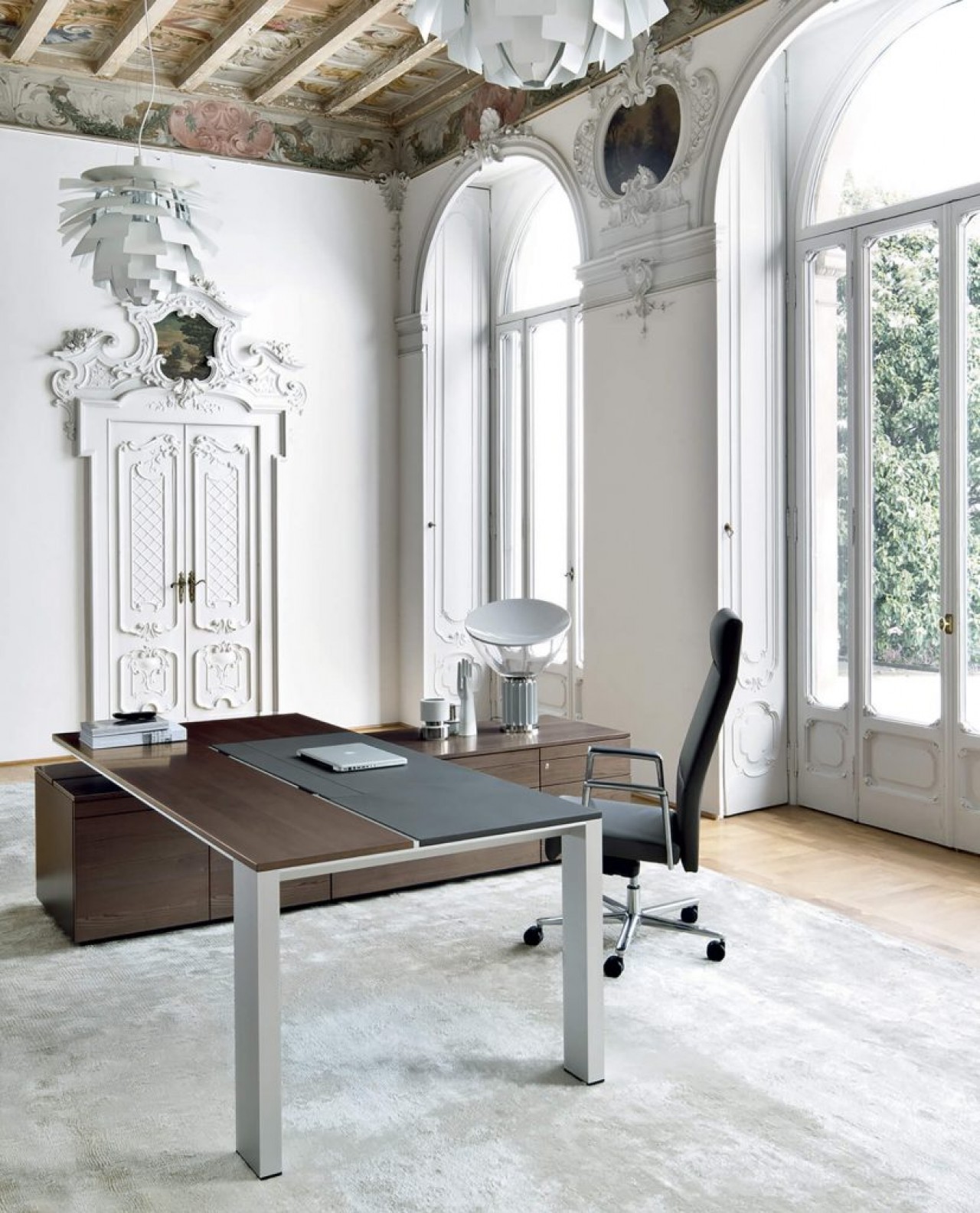 El diseño moderno del escritorio ejecutivo Ono se caracteriza por la robustez y elegancia de la estructura de aluminio combinada con materiales de calidad como la madera y el cuero