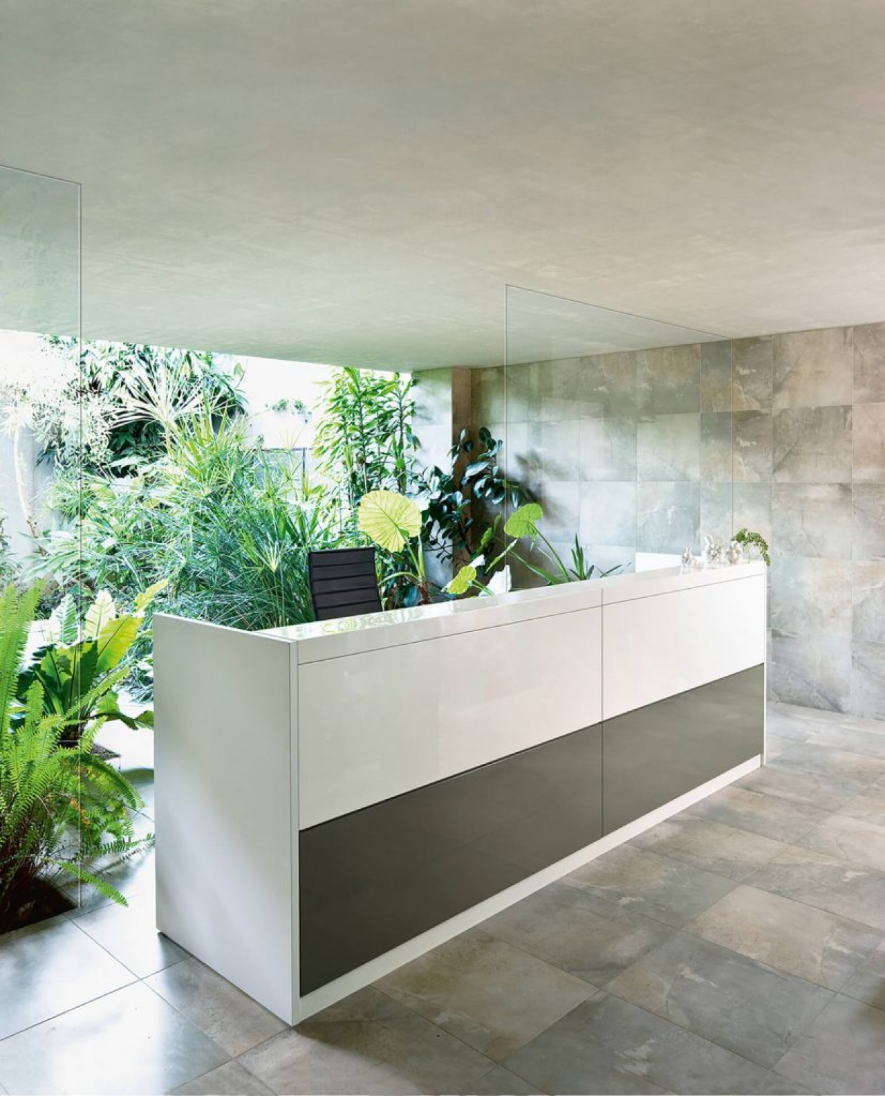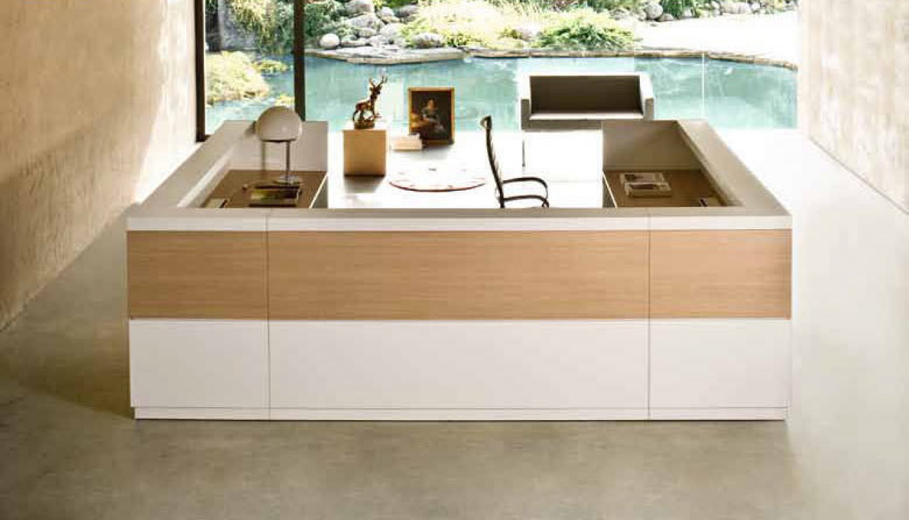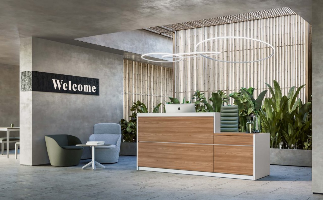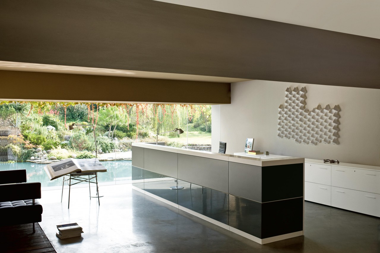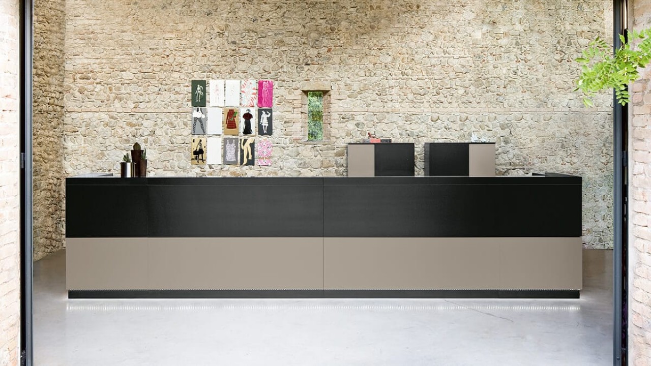 Las encimeras de recepción de melamina de 28 mm de espesor están equipadas con un acceso superior para la electrificación del puesto de trabajo. La encimera de recepción de 70 mm de espesor está trabajada con tecnología de plegado mediante paneles de MDF y tiene un ancho de 210 mm. Sobre este es posible fijar una balda en cristal extrafloat transparente, de 30 cm de profundidad, que dota al mostrador de recepción de una cómoda superficie de apoyo para consultas. El módulo rebajado H. 74 cm con tapa de recepción de melamina y 105 cm de profundidad, mejora los niveles de comunicación sin limitar la autonomía operativa. La recepción Vogue se puede equipar con muebles de almacenaje de 109 cm de altura, cajoneras de melamina o contenedores de altura de escritorio.