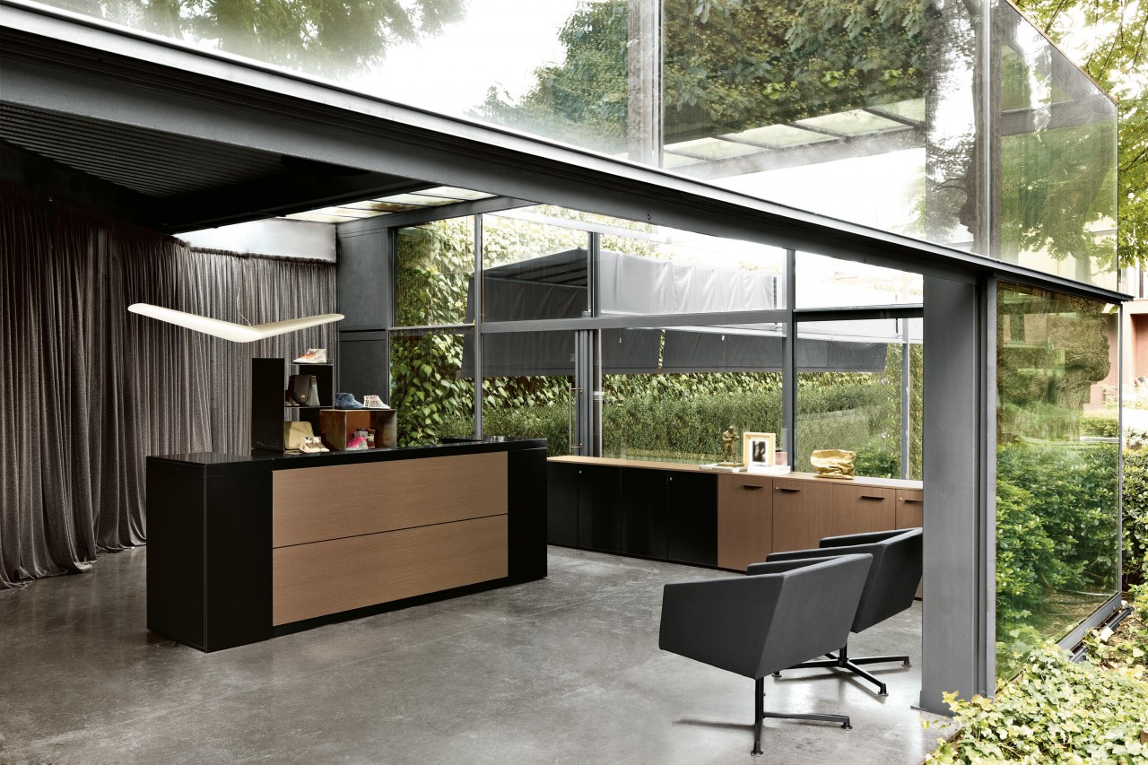 Los paneles rectangulares, de 470 mm de altura, son intercambiables entre sí y en los módulos de esquina están unidos a 45 ° en el borde. La forma recta es la base de numerosas configuraciones que permiten amueblar el espacio con un estilo representativo y único. Los elementos modulares lineales L.70 - 120 - 160 - 200 cm y los elementos de esquina son modulares, reconfigurables y se adaptan al espacio disponible permitiendo combinar la recepción con la funcionalidad interna.