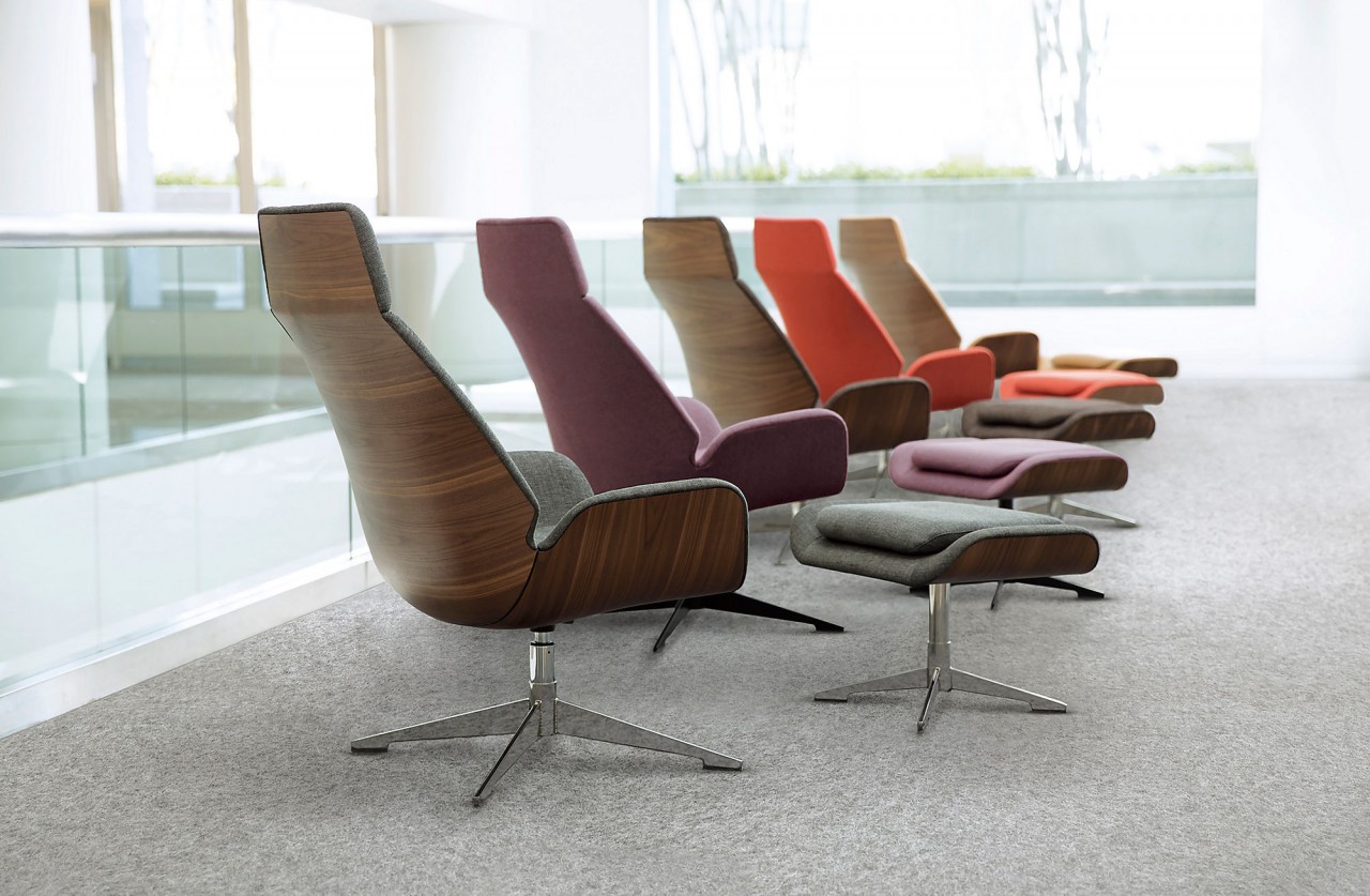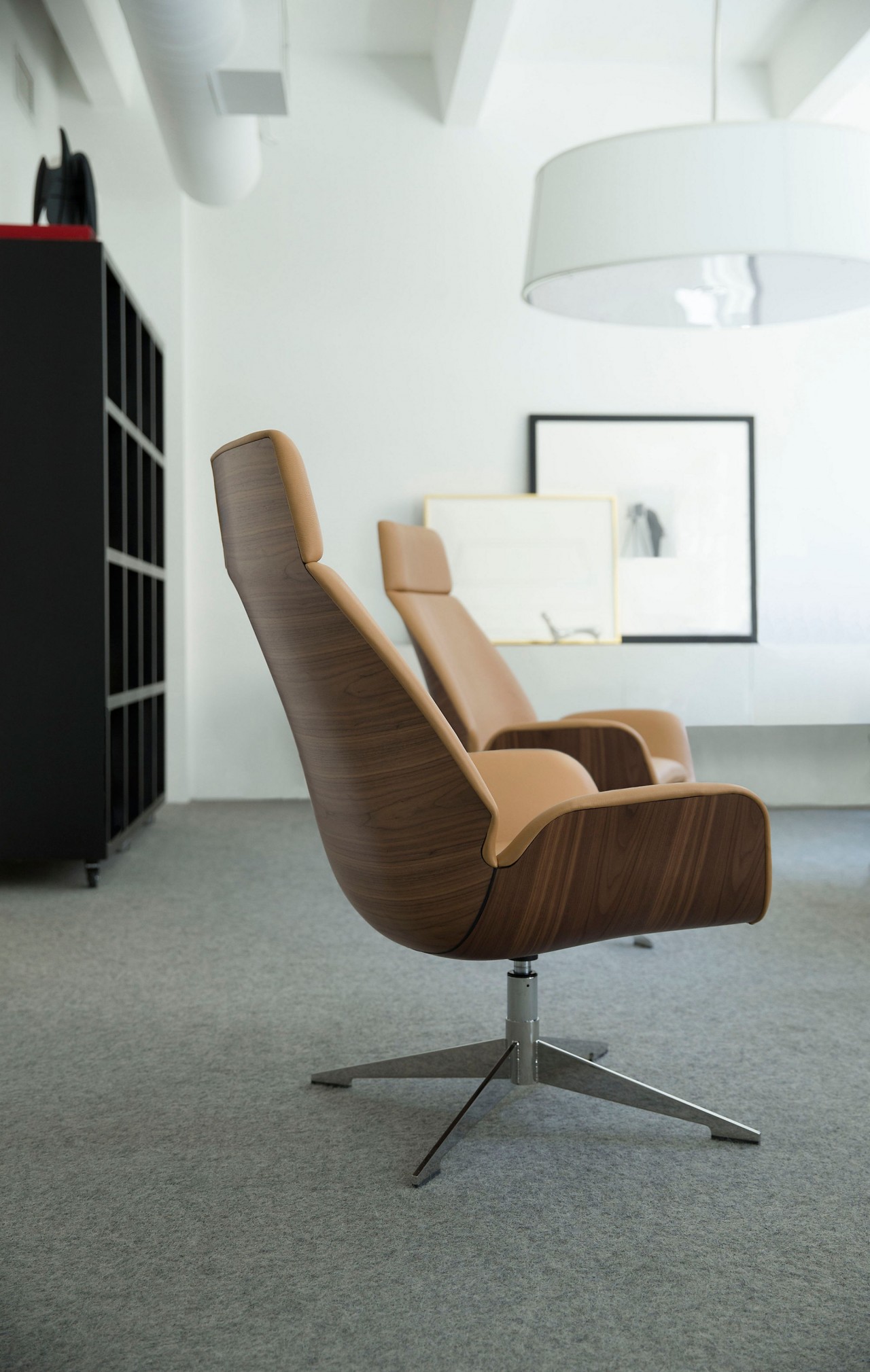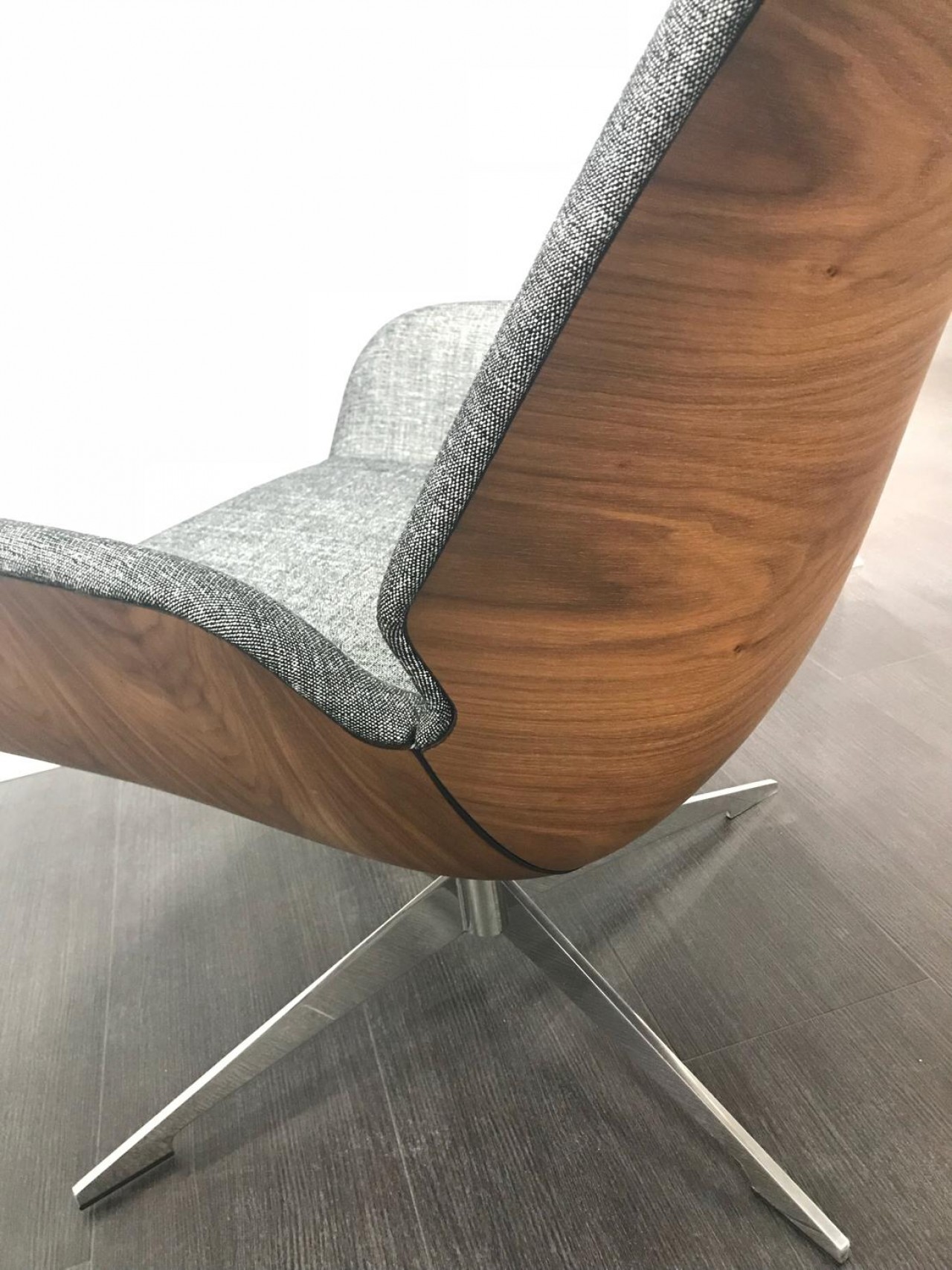 La opción de respaldo de madera es especialmente llamativa, ya que muestra la madera excepcional que se encuentra en un excepcional nogal de corte plano. La otomana complementa estas dos opciones, disponibles con una cáscara de nuez para resaltar la madera natural, o totalmente tapizadas. La base Conexus está disponible en acero inoxidable pulido o con recubrimiento en polvo negro.