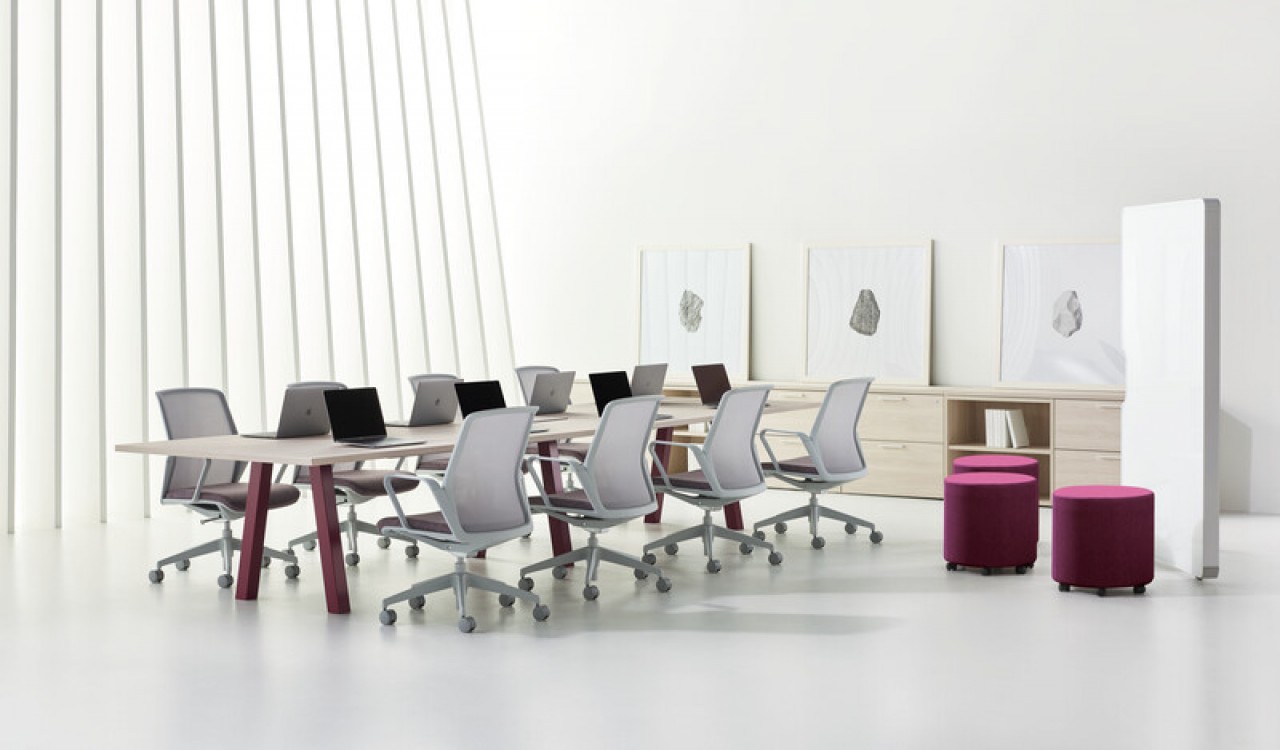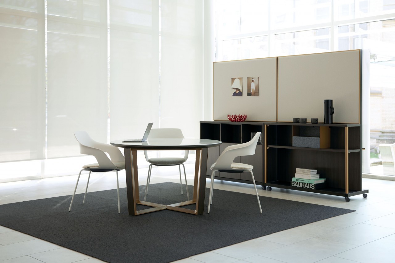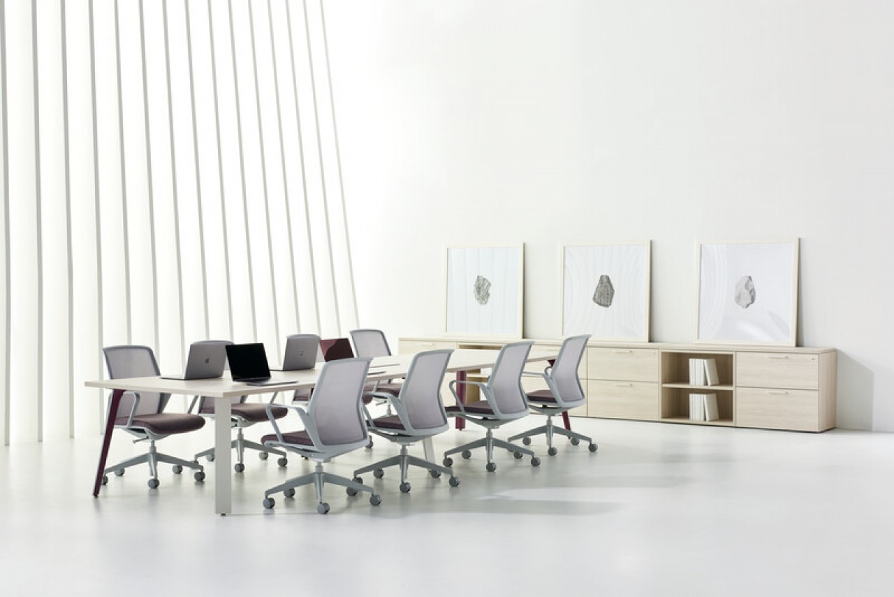 La línea comprende varias formas de mesa y opciones de soporte, y se puede equipar con un sistema integrado de gestión de cables que proporciona energía y datos a la superficie de la mesa.