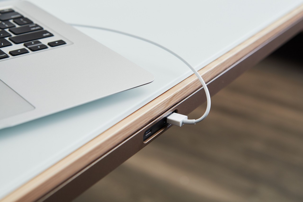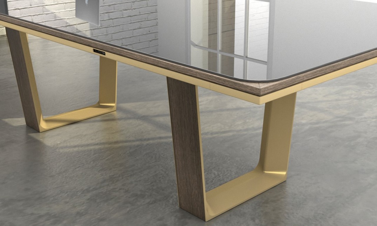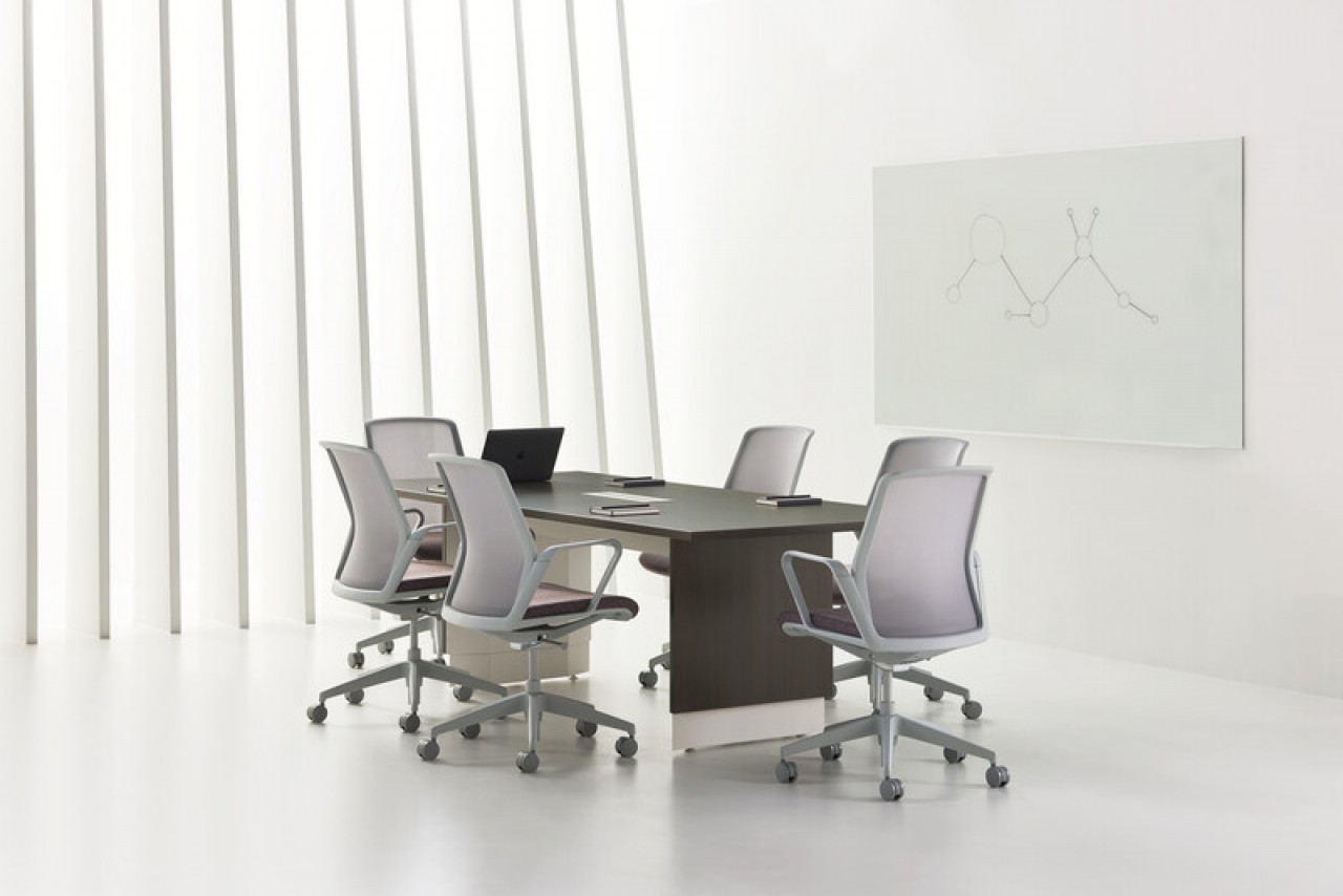La línea comprende varias formas de mesa y opciones de soporte, y se puede equipar con un sistema integrado de gestión de cables que proporciona energía y datos a la superficie de la mesa.