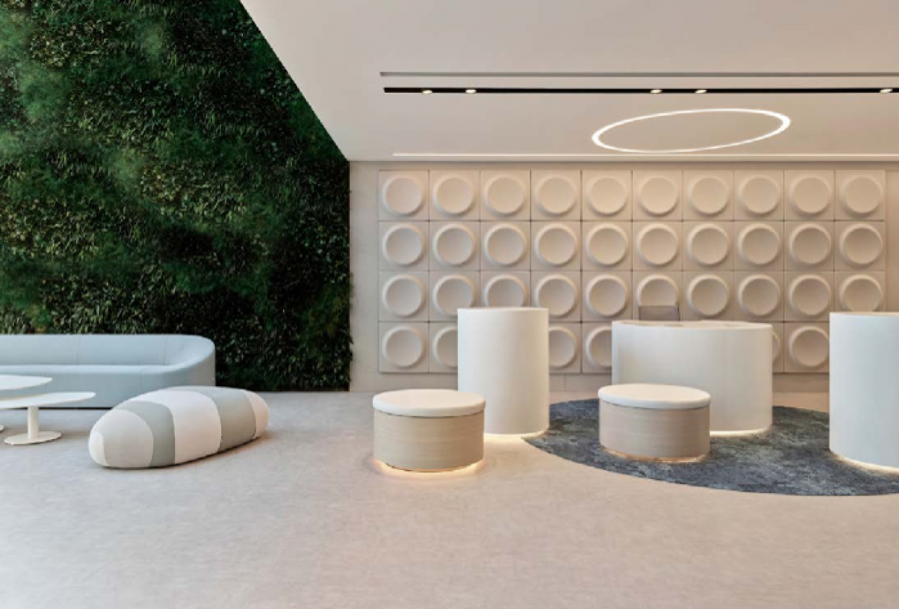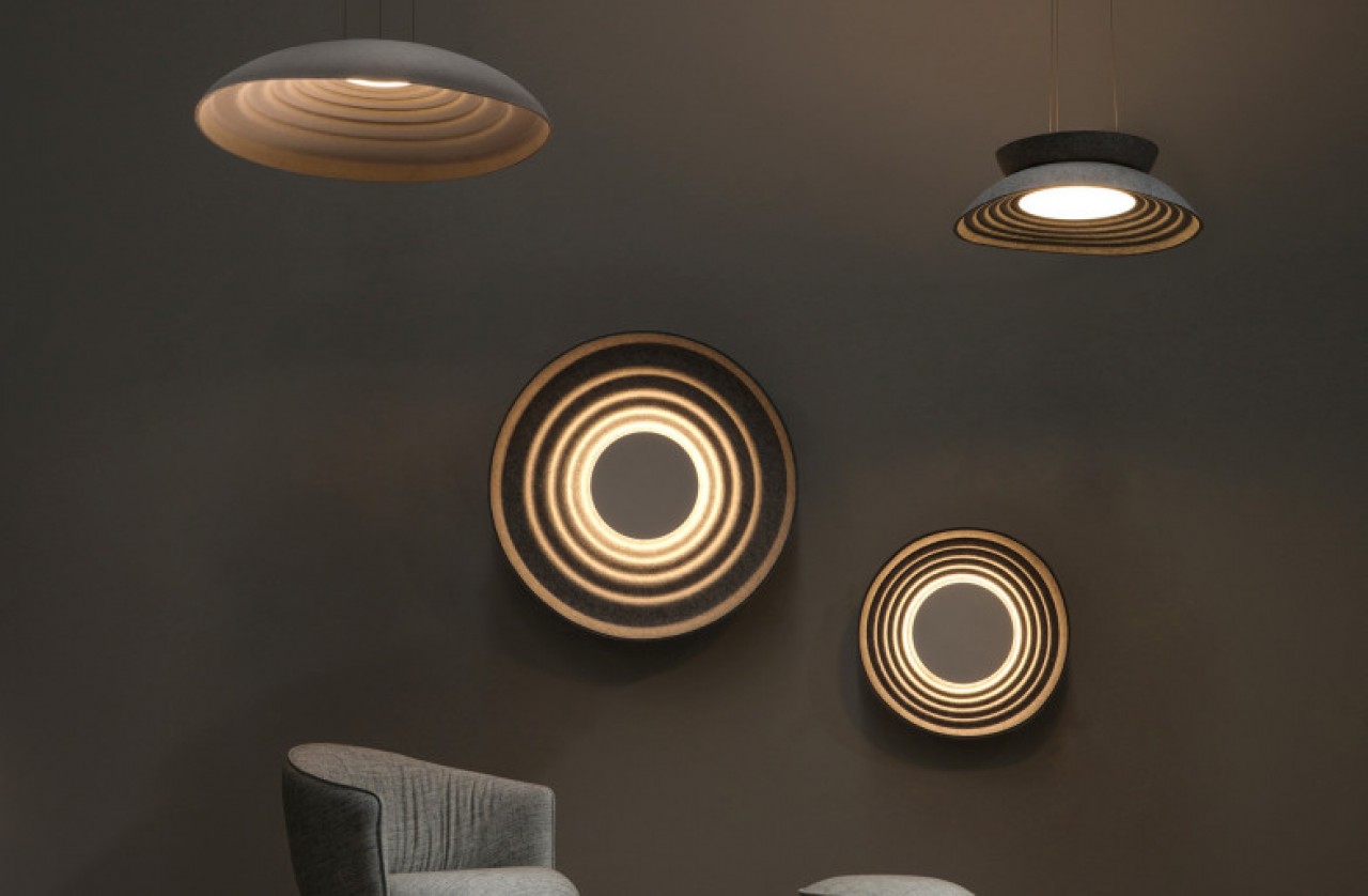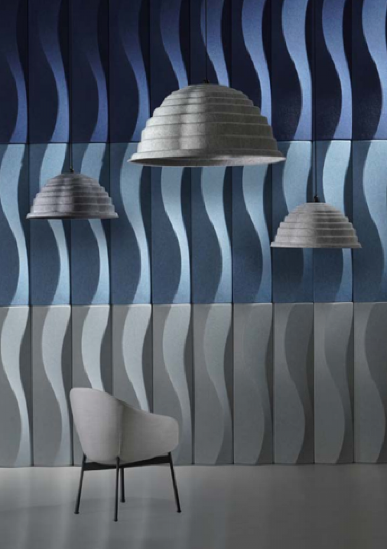 Paneles Acústicos que dan a las superficies un aspecto personalizado sin dejar de ser sostenibles. Las colecciones abarcan formas con aplicaciones de pared, techo, iluminación y Paneles.