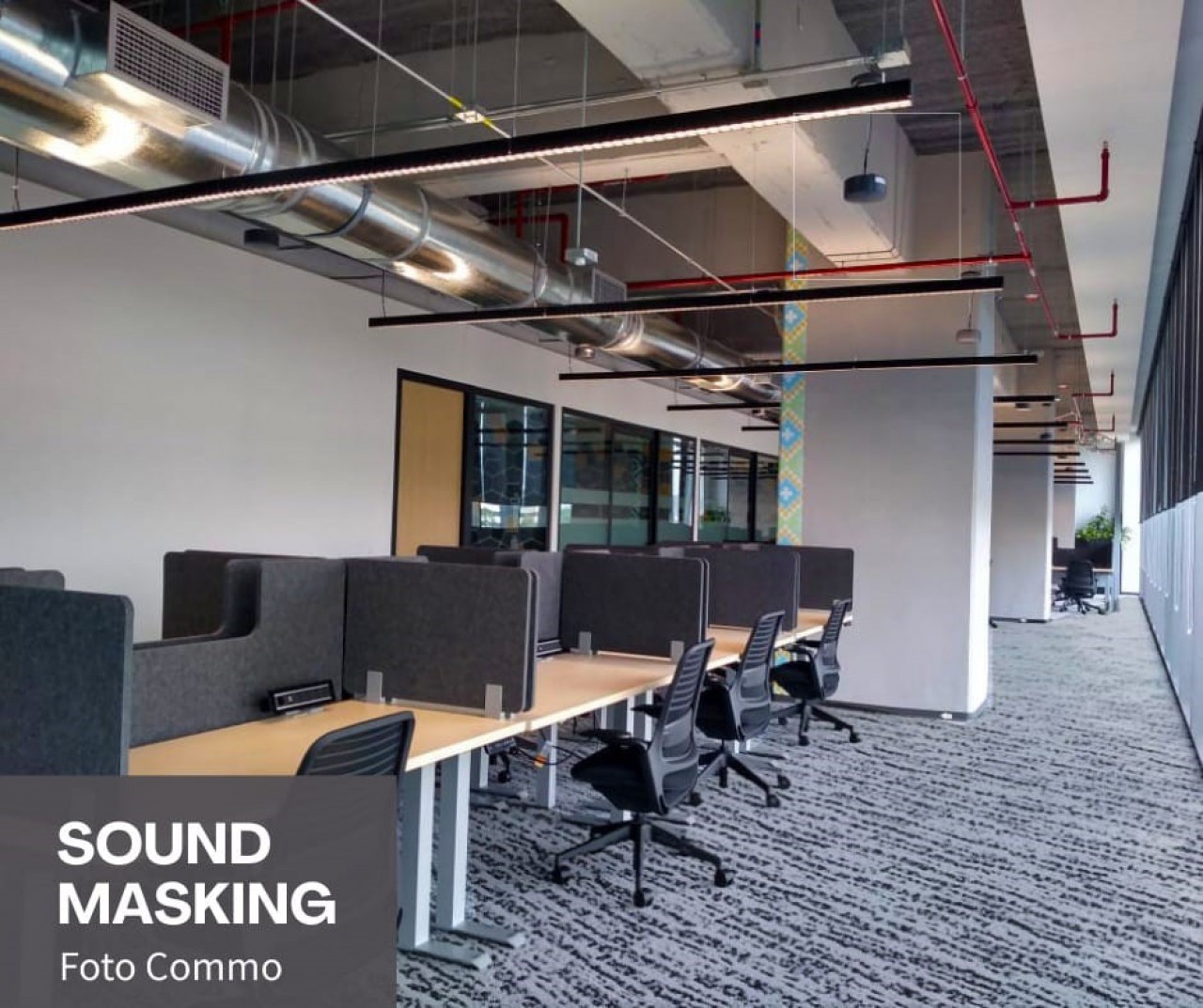 Sistema de enmascaramiento de sonido para mejorar el entorno de trabajo, incrementando productividad, privacidad, concentración y disminuyendo el estrés generado por el ruido.