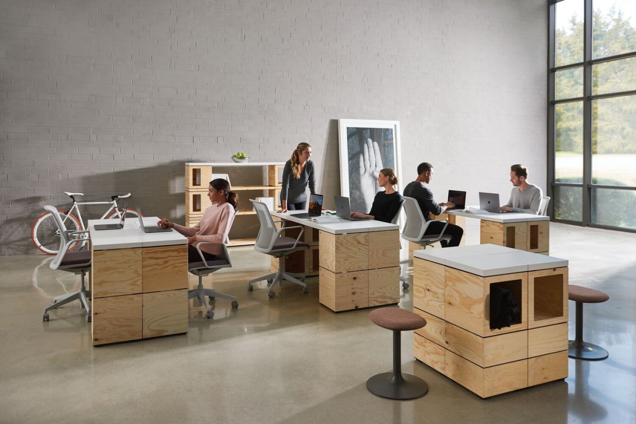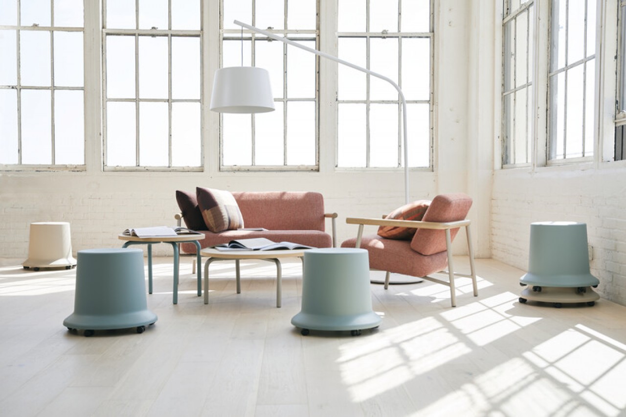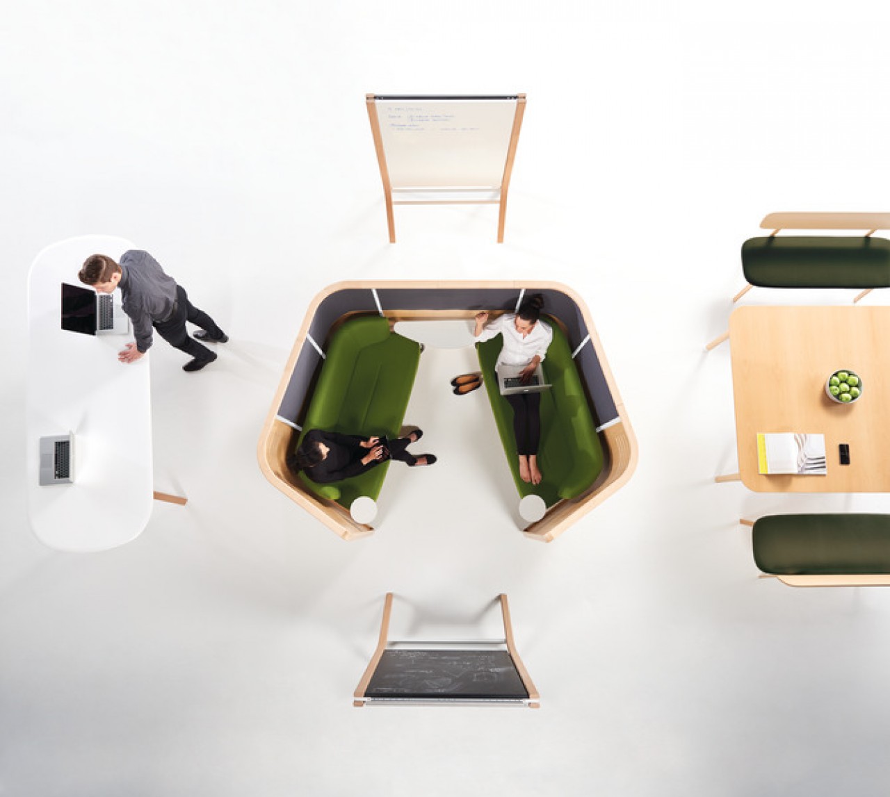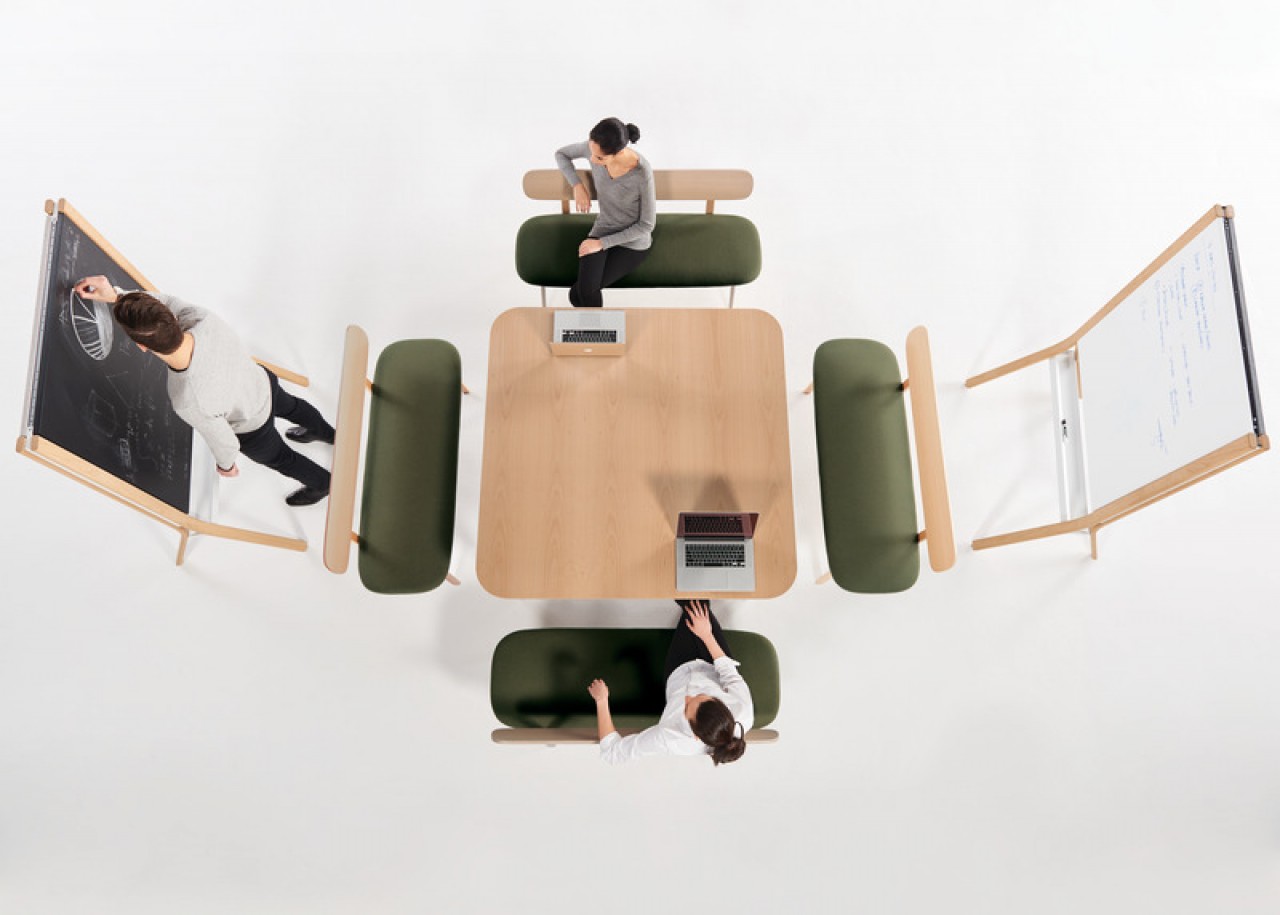 La colección permite construir un espacio de trabajo completo para un estudio pequeño y unido o crear centros de trabajo informales "pop-up" en la extensión de una oficina corporativa.
