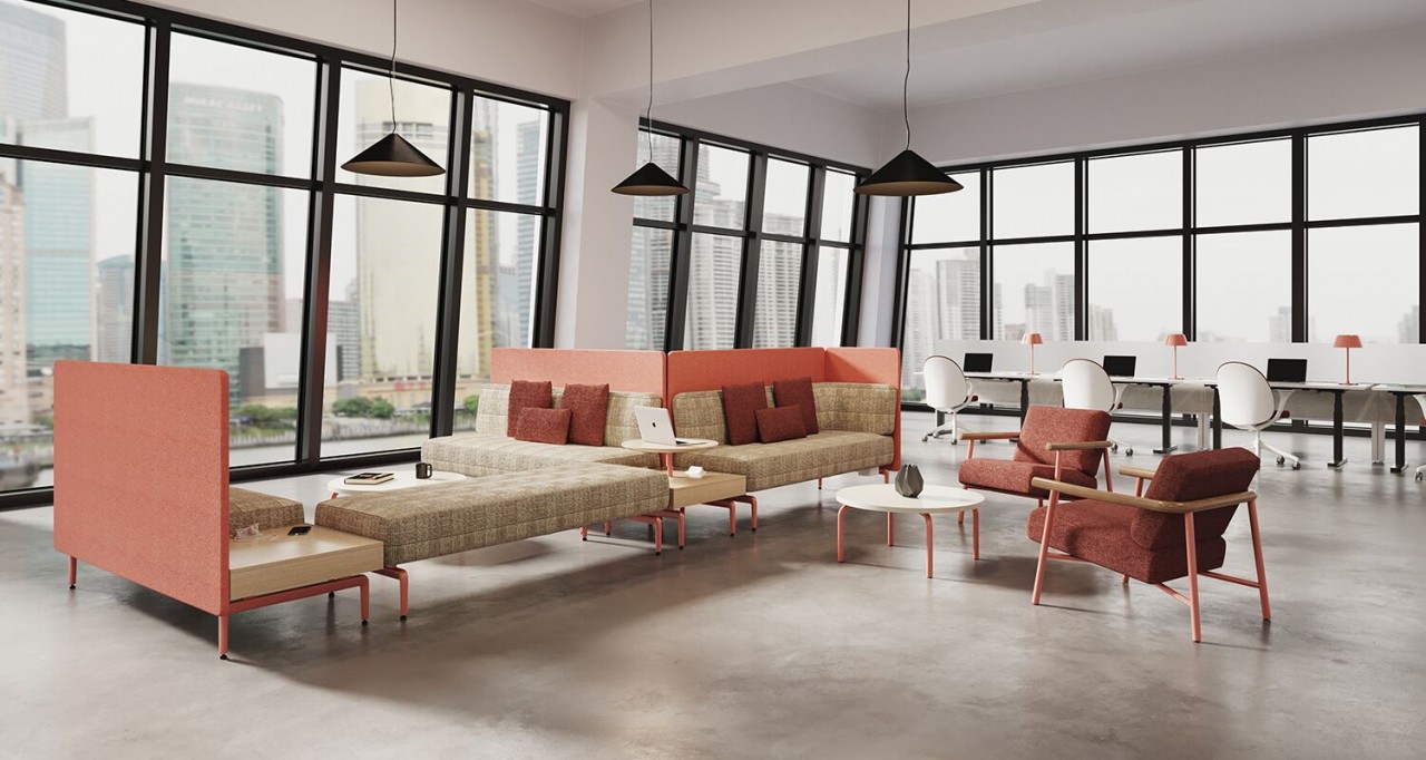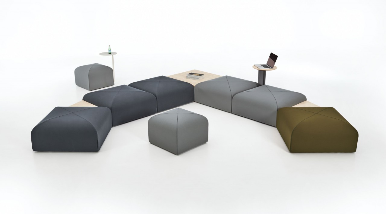 Es ideal para espacios donde la gente se reúne a trabajar, conversar, relajarse o descansar. La colección se compone de módulos de asientos que se conectan en diferentes configuraciones; más mesas auxiliares que brindan superficie, almacenamiento y acceso a la electricidad. Las mesas encajadas entre módulos permiten combinaciones que forman una curva o ángulo adecuado al espacio y la actividad.
