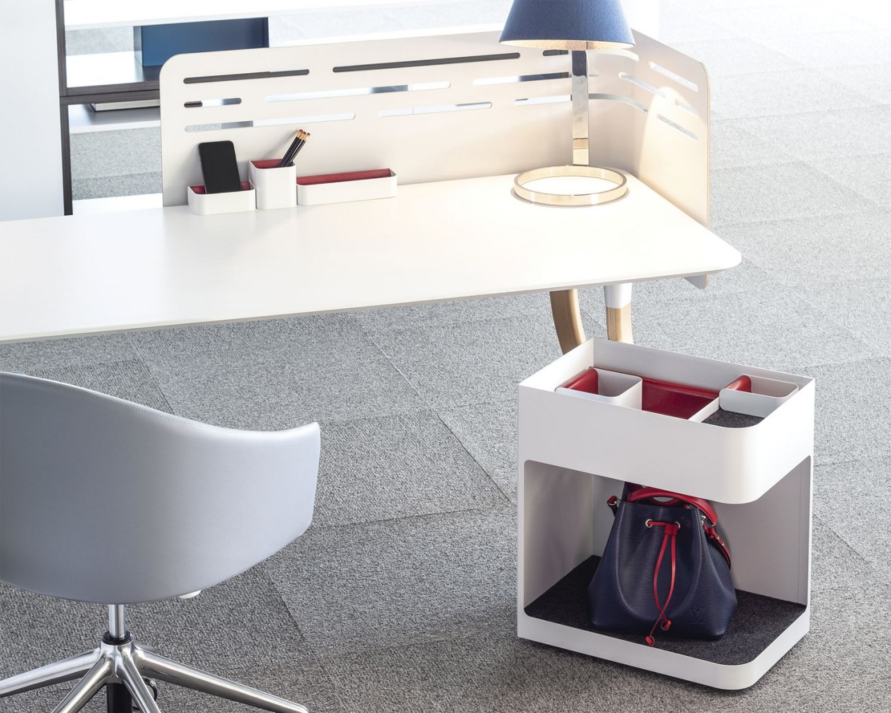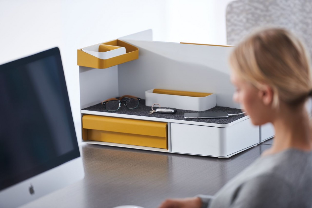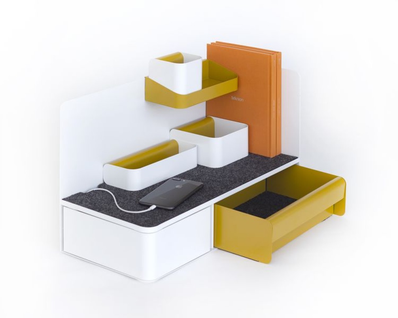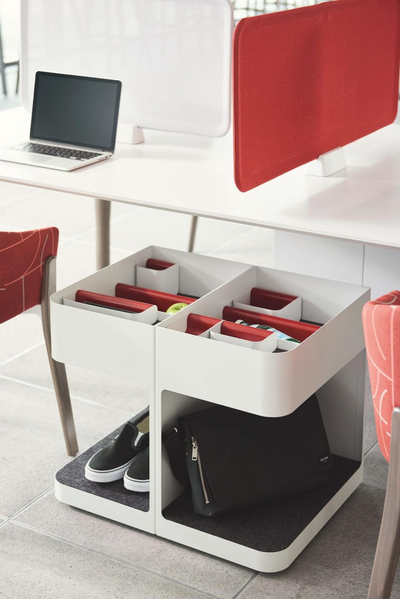 La colección de almacenamiento se conforma por: "Desktop Optimizer", "Mini Bag Drop" y "Bag Drop". Estos proporcionan un alto grado de personalización, equilibrando volúmenes abiertos y cerrados. "Desktop Optimizer" ofrece almacenamiento en la superficie de trabajo y división del espacio informal. Cuenta con una superficie superior con múltiples opciones de materiales y un volumen cerrado con puerta con bisagras con alimentación USB opcional. Se puede especificar un estante para hojas integrado o un contenedor extraíble, junto con accesorios adicionales de tn, para personalizar aún más la unidad. Mini Bag Drop y Bag Drop ofrecen almacenamiento móvil informal de artículos personales y bolsas de trabajo debajo de la superficie de trabajo. Cuentan con un estante superior para artículos pequeños, donde se pueden combinar combinaciones de accesorios tn opcionales para personalizar aún más la unidad.