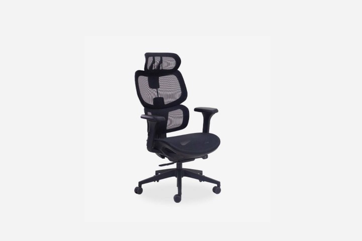 Silla ergonómica con respaldo y asiento en malla negra de terminación cascada que mantiene la frescura incluso en las jornadas más largas, cabecera autoajustable y soporte lumbar fijo para cuidar tu postura mientras trabajas.