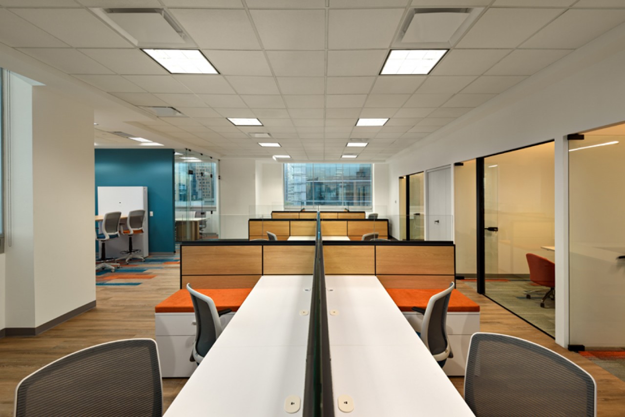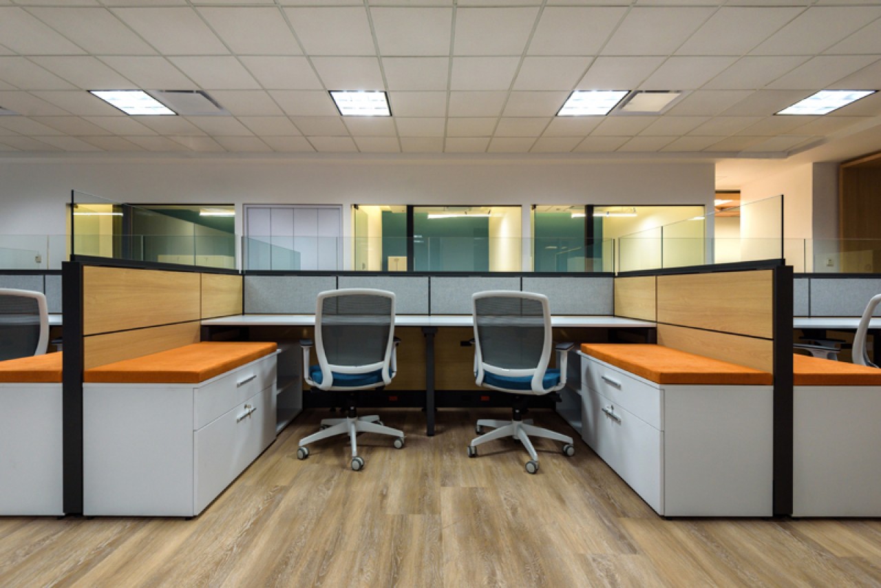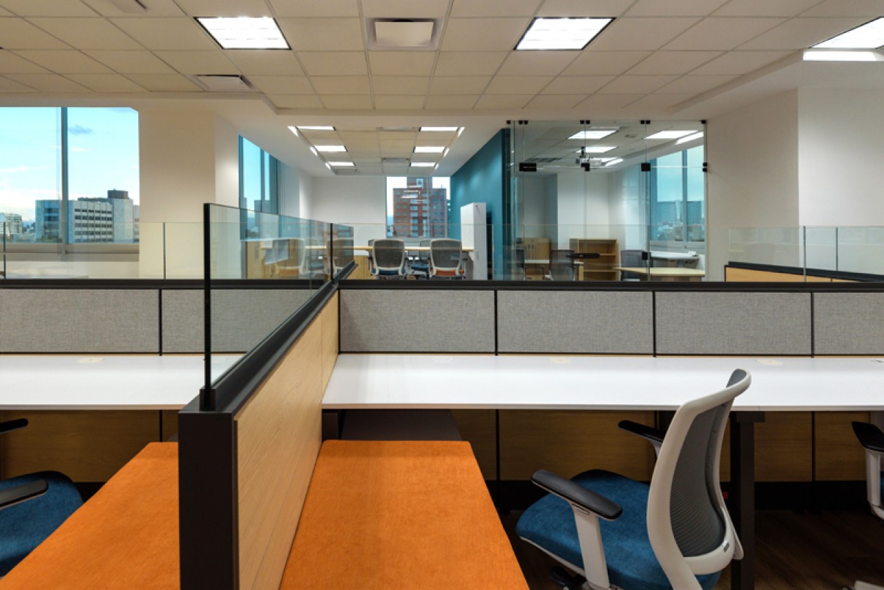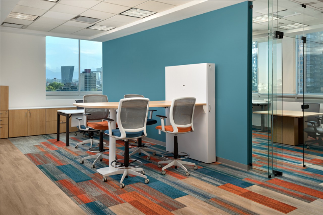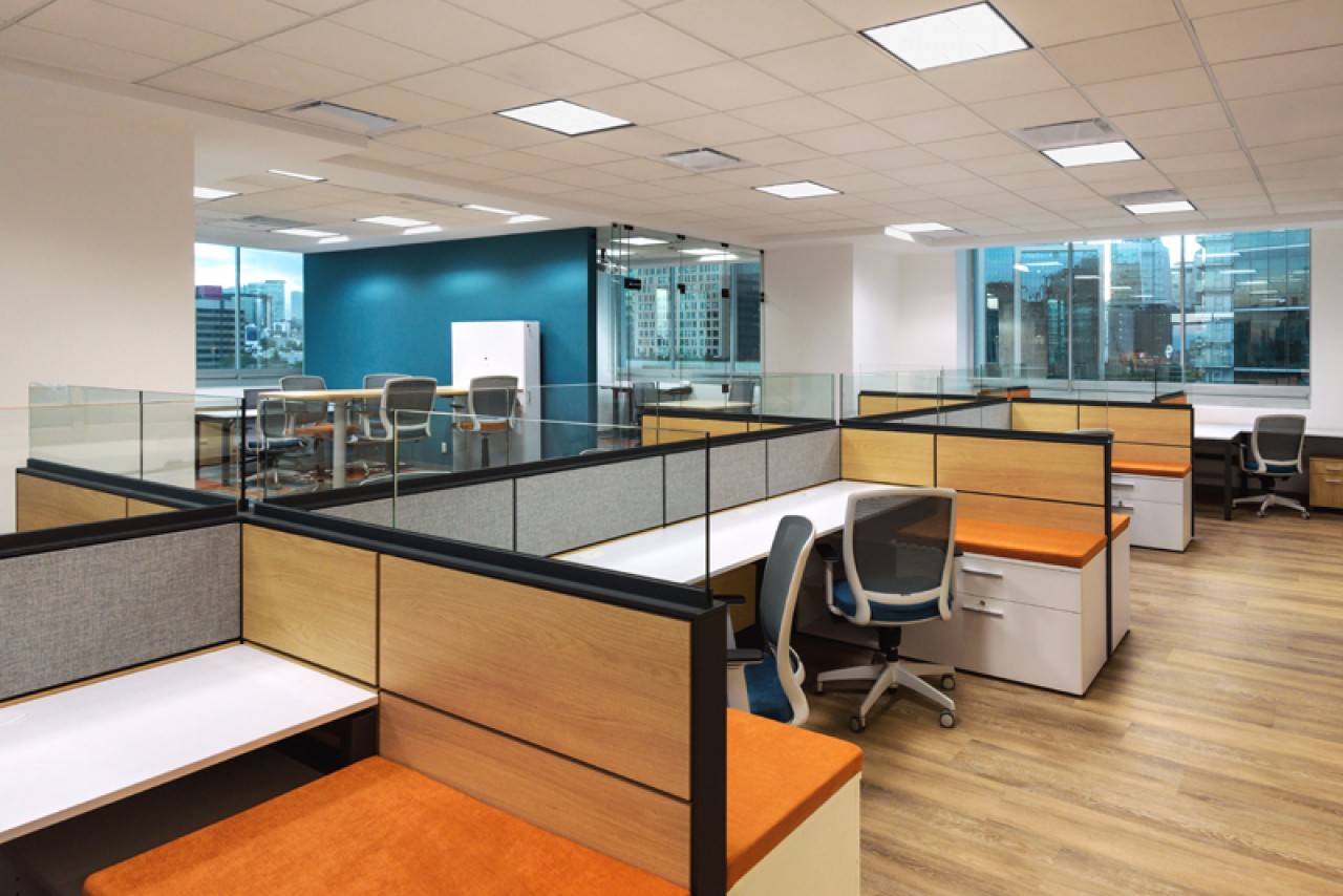 El diseño de este proyecto está en colores azul y su contrario anaranjado, se utilizó piso laminado combinado con alfombrado de estos mismos colores. Se añadieron áreas cerradas de seguridad, cubículos privados y estaciones de trabajo, además de áreas donde los usuarios pueden levantarse de su lugar asignado y puedan tener ya sea una junta rápida o espacios donde puedan trabajar más relajados. ....