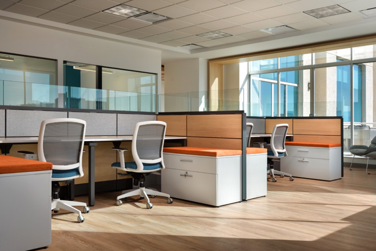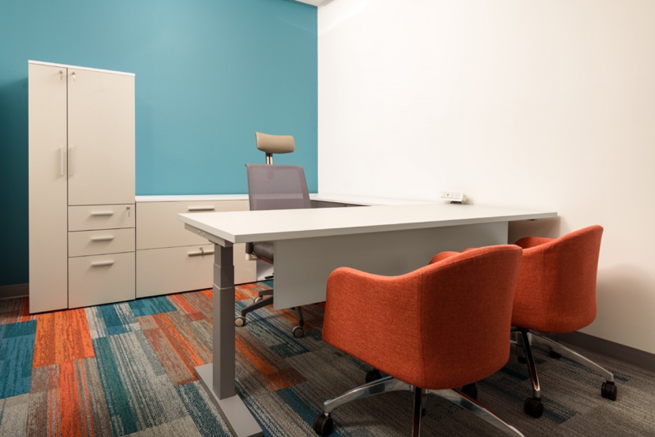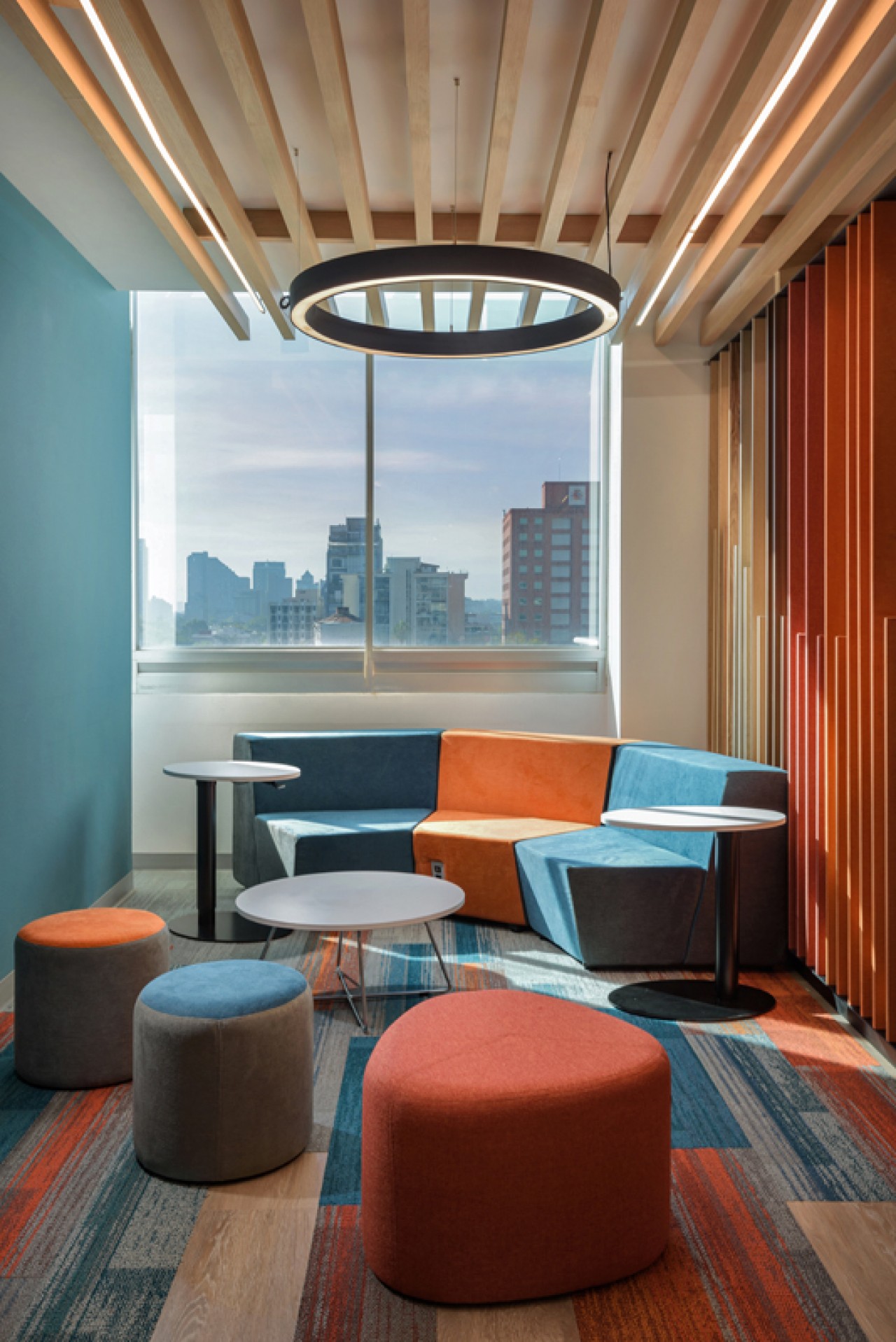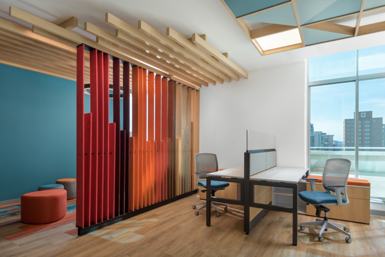 El diseño de este proyecto está en colores azul y su contrario anaranjado, se utilizó piso laminado combinado con alfombrado de estos mismos colores. Se añadieron áreas cerradas de seguridad, cubículos privados y estaciones de trabajo, además de áreas donde los usuarios pueden levantarse de su lugar asignado y puedan tener ya sea una junta rápida o espacios donde puedan trabajar más relajados. ....