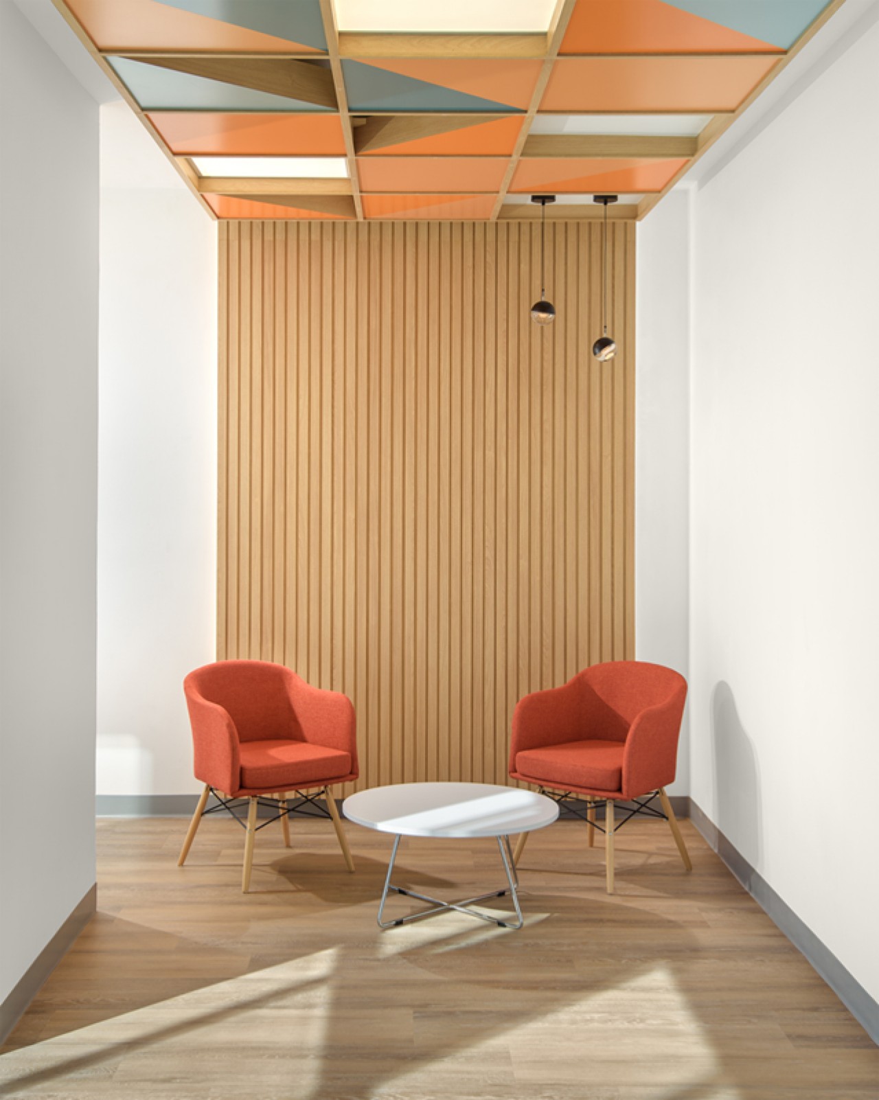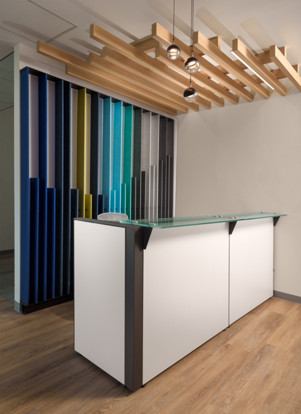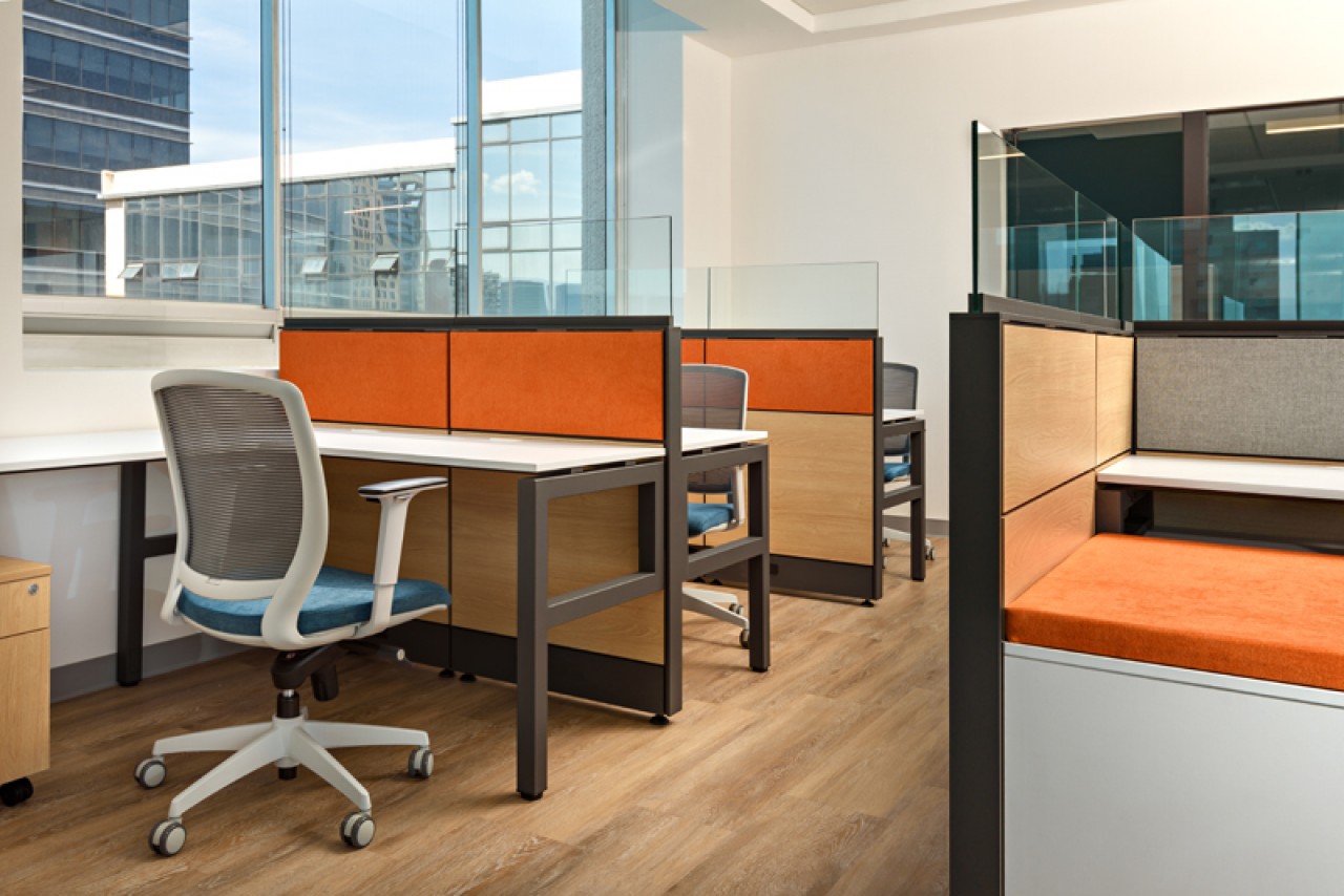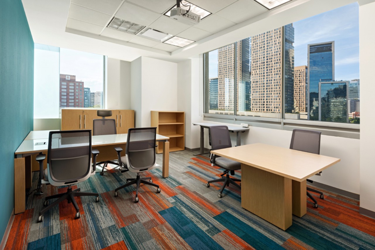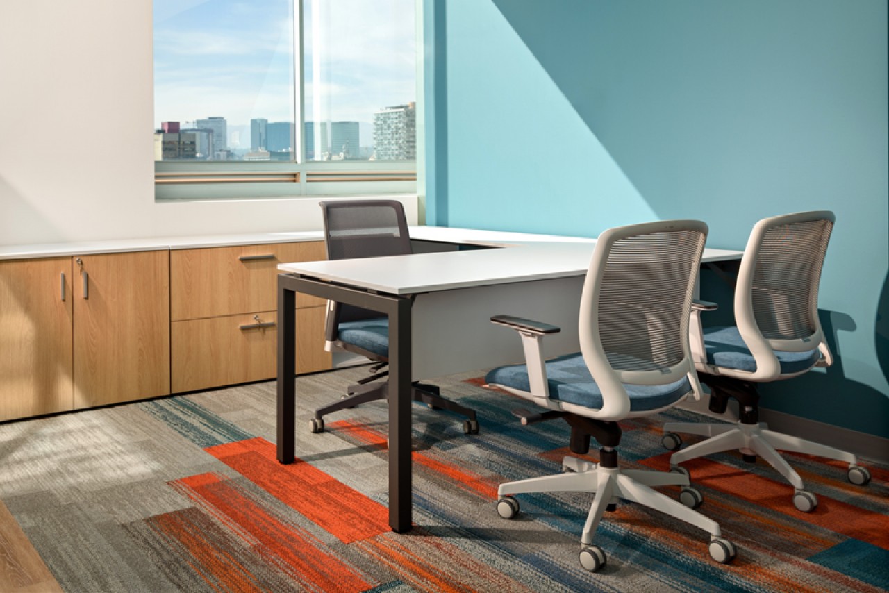 El diseño de este proyecto está en colores azul y su contrario anaranjado, se utilizó piso laminado combinado con alfombrado de estos mismos colores. Se añadieron áreas cerradas de seguridad, cubículos privados y estaciones de trabajo, además de áreas donde los usuarios pueden levantarse de su lugar asignado y puedan tener ya sea una junta rápida o espacios donde puedan trabajar más relajados. ....