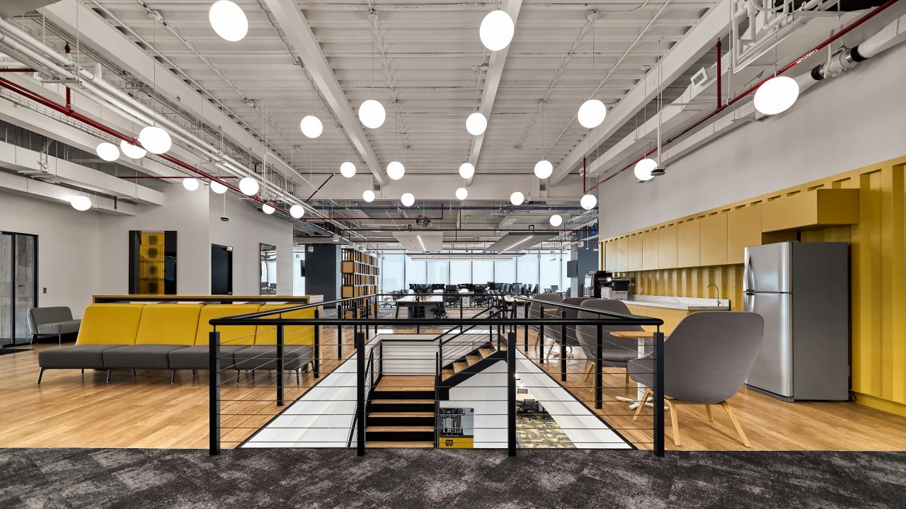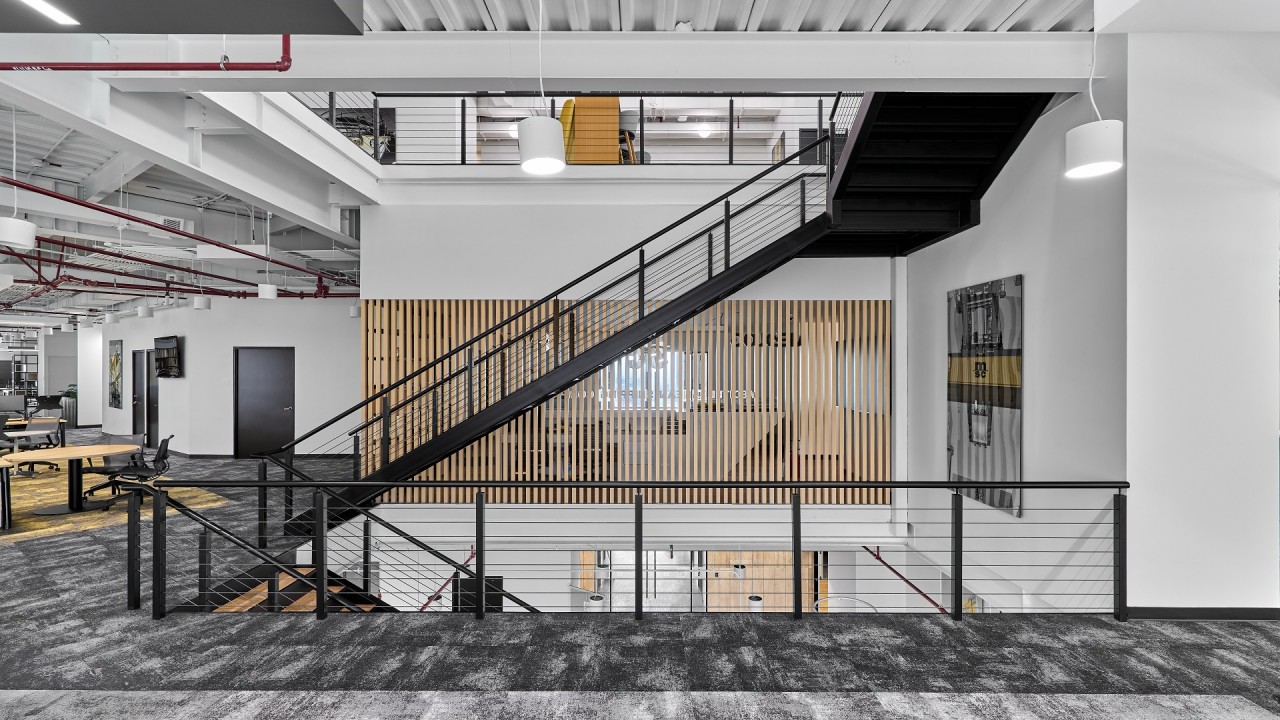 Otro componente emblemático del proyecto fue la creación de una escalera que conecta los distintos pisos ocupados por la empresa. Desde el planteamiento inicial, el cliente manifestó su deseo de fomentar la colaboración entre los equipos de trabajo, y esta escalera se convirtió en símbolo de esa conexión. Su diseño moderno y minimalista contrasta con la robustez del resto del espacio, convirtiéndose en un punto de interés arquitectónico. Su construcción representó un importante reto técnico, ya que requirió intervenir la estructura del edificio. Trabajamos de forma estrecha con un equipo de ingenieros estructurales para garantizar la seguridad e integridad del inmueble, logrando que la escalera no solo cumpliera su función operativa, sino que también se convirtiera en un elemento protagónico dentro del diseño.