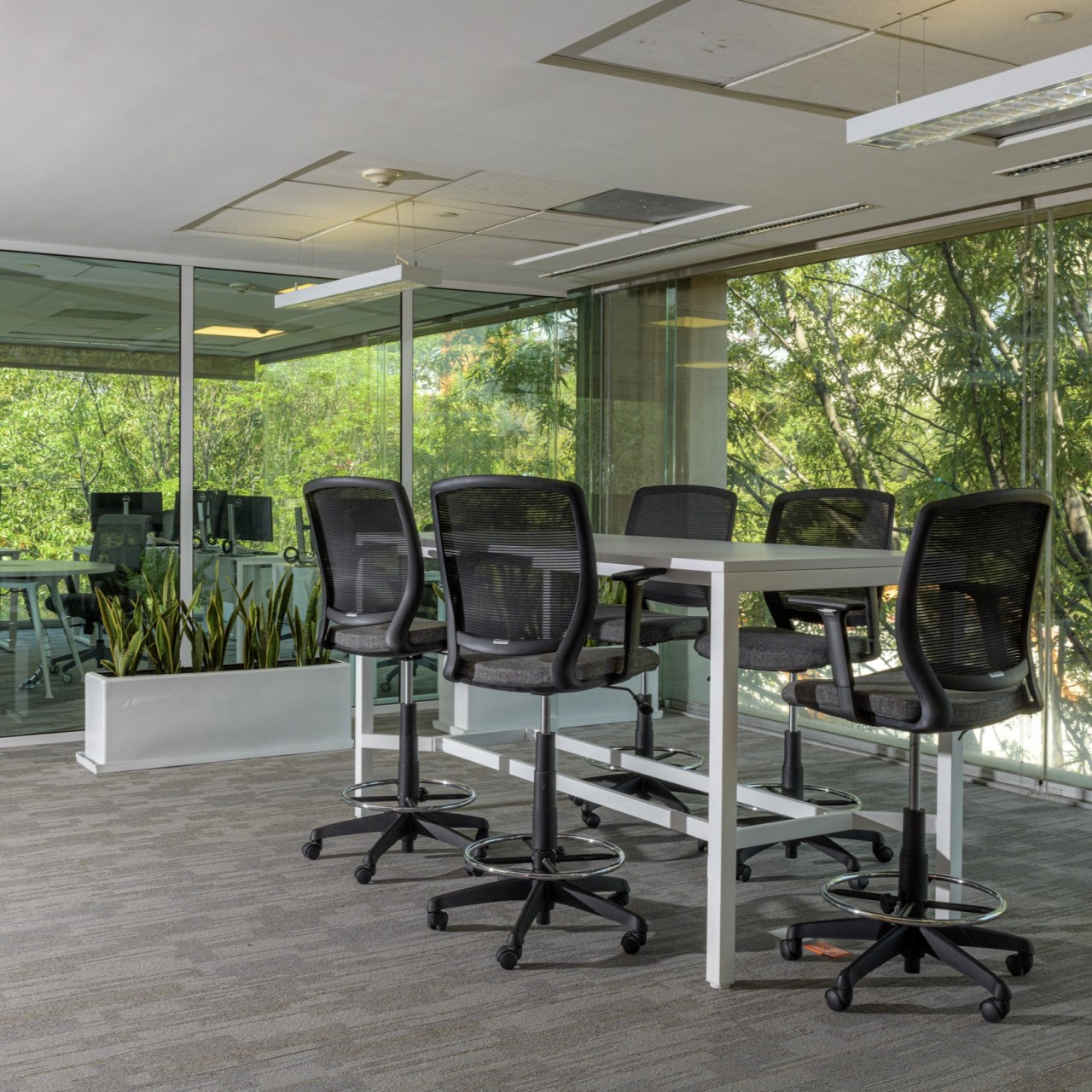 • Zona de altura media: Mesas altas con taburetes de respaldo en malla y reposapiés, ideales para reuniones breves o trabajo alternativo.