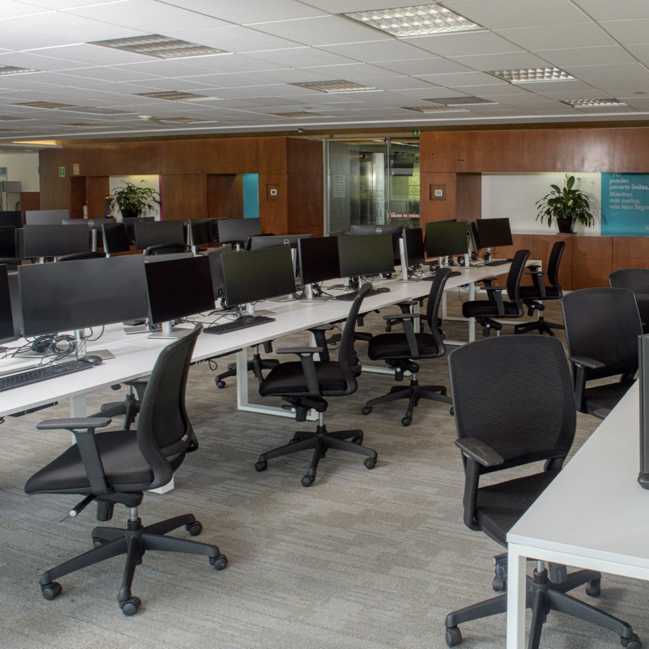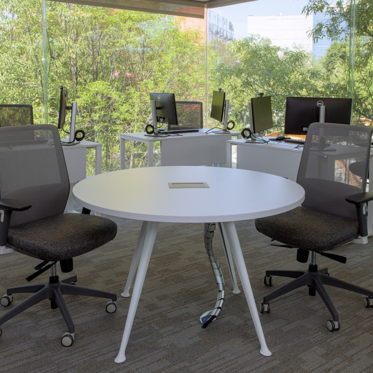 • Áreas de colaboración: Mesas redondas con sillas móviles permiten reuniones rápidas y trabajo en equipo, integradas dentro del área operativa.
