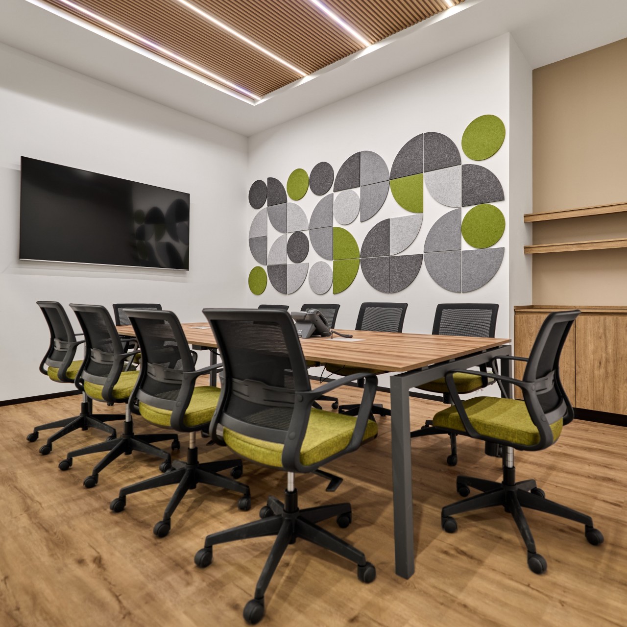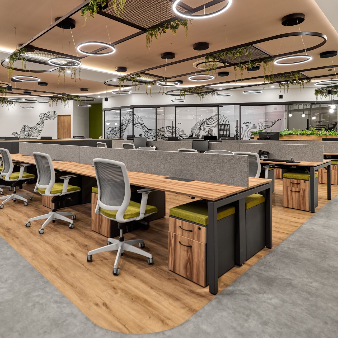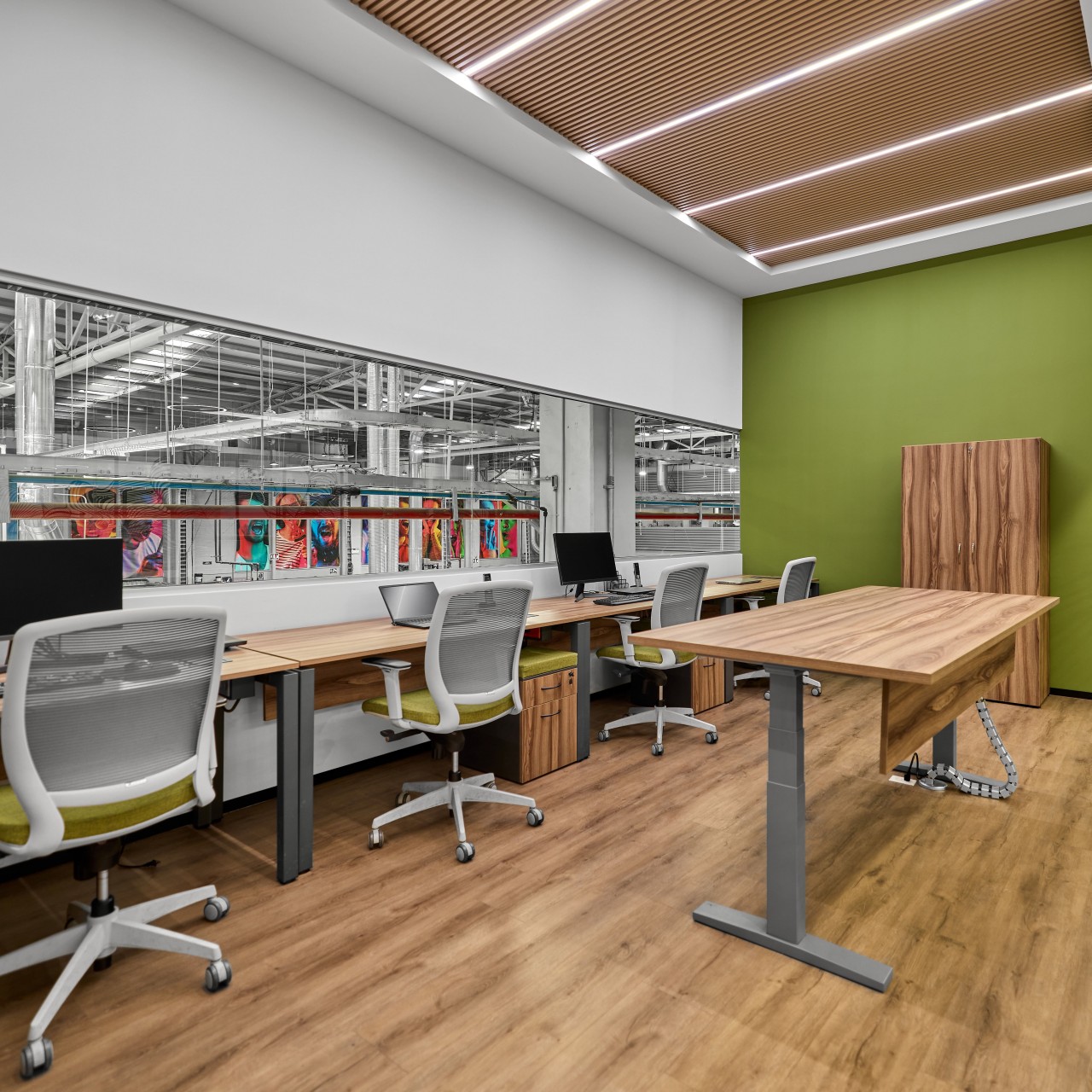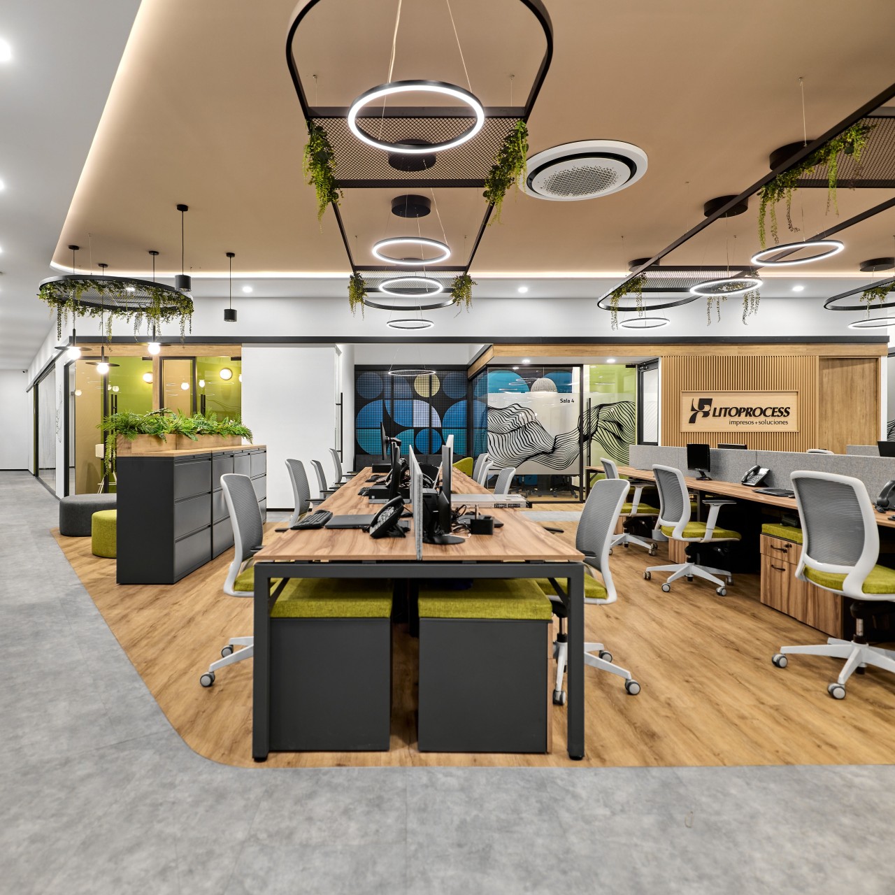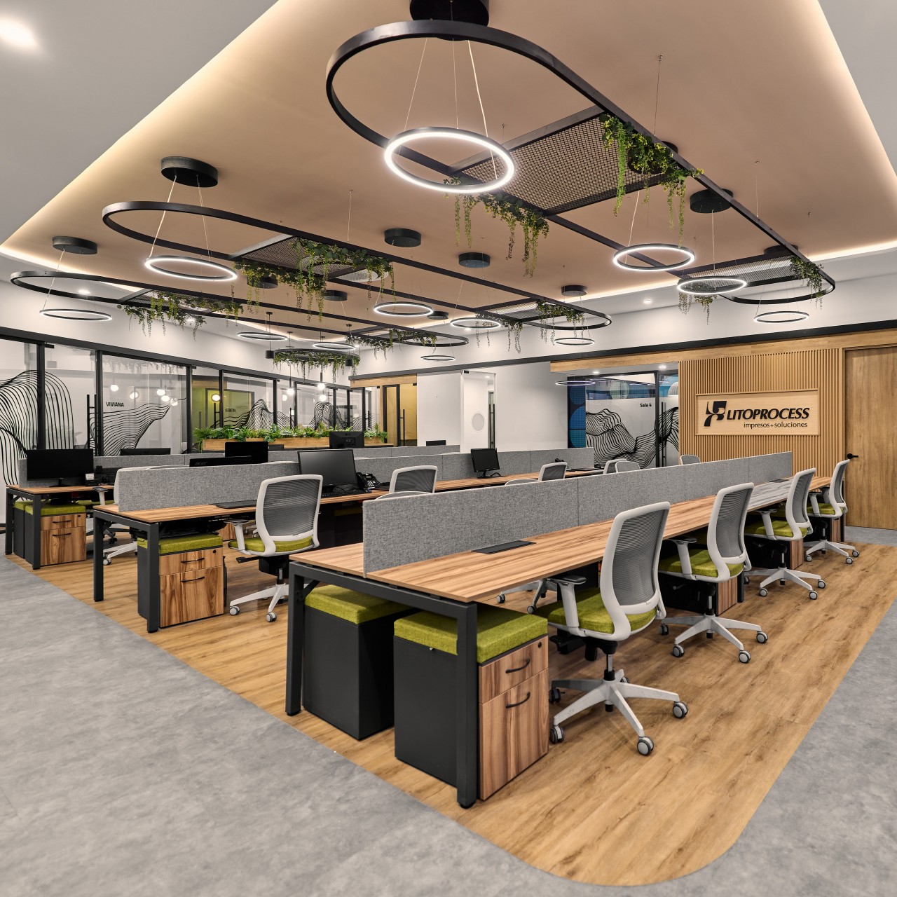 El diseño para Litoprocess se concibió como una solución integral que responde a las necesidades operativas para oficinas de una imprenta moderna, combinando eficiencia espacial, ergonomía y una estética contemporánea que refleja dinamismo y creatividad. La distribución en planta abierta permite una circulación fluida y una comunicación efectiva entre los equipos. Se utilizaron estaciones de trabajo Sanders®, caracterizadas por su estructura robusta y acabados en chapa de madera, que aportan calidez al entorno. Las divisiones en tela gris entre estaciones brindan privacidad visual sin romper la continuidad del espacio. Las mesas ovales de altura variable se integran en zonas colaborativas, fomentando reuniones ágiles y trabajo en equipo, adaptándose a diferentes dinámicas laborales gracias a su versatilidad ergonómica. En cuanto a la sillería, se seleccionaron modelos Lacerta® y Corvi®, las sillas destacan con sus respaldos en malla y asientos en tonos verdes, aportando frescura y confort. Los taburetes gota y circulares complementan áreas de descanso y colaboración informal.