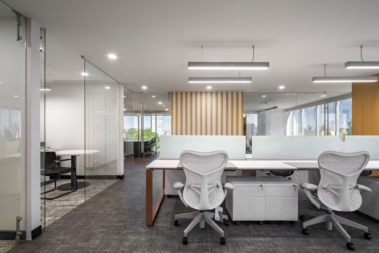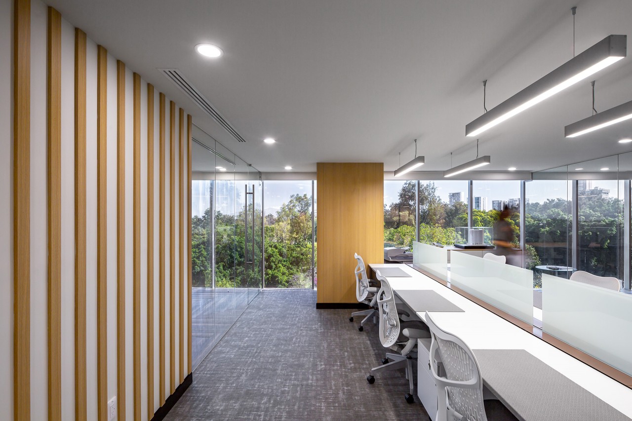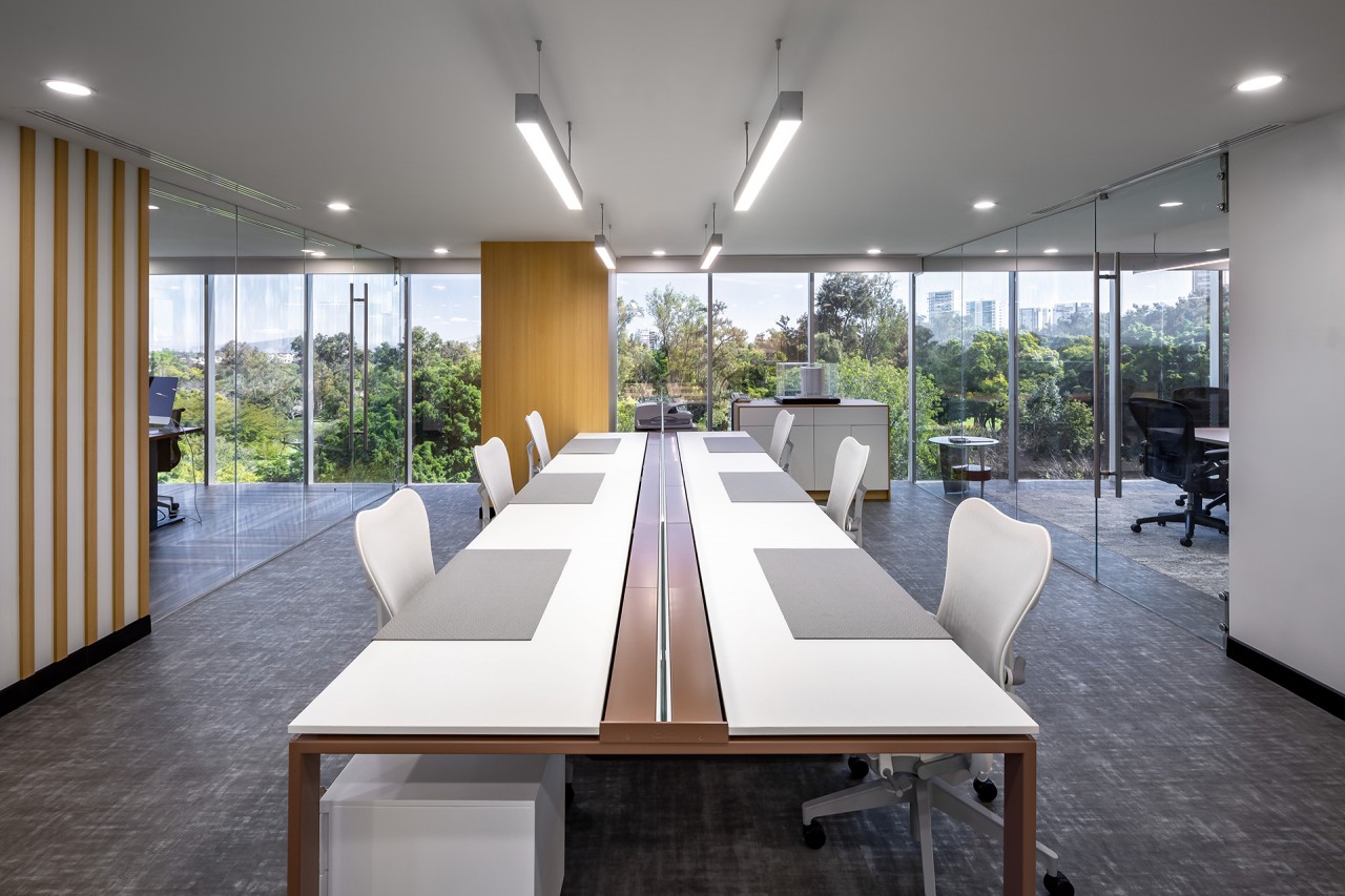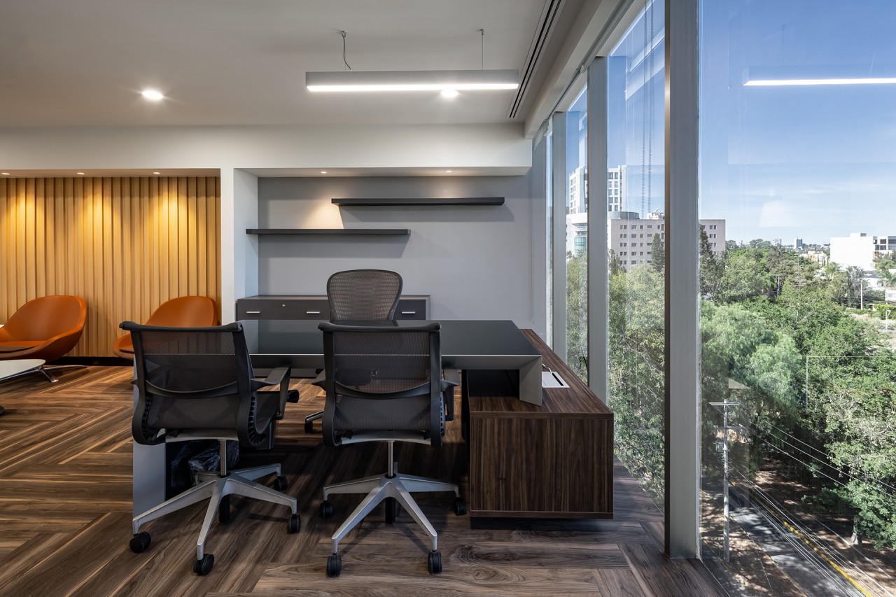 Justo al fondo del área contamos con dos oficinas privadas, el privado principal y el secundario. El principal cuenta con un amplio espacio con mobiliario cómodo, donde se pueden llevar a cabo reuniones más informales al igual que un escritorio de gran tamaño para trabajo más focalizado. El privado secundario es un poco mas pequeño y cuenta solo con un escritorio el cual cuenta con la función de poder elevarse para trabajar de pie, esto para cambiar de posición después de un largo periodo de trabajo. Ambos cuentan con su propio baño privado al centro y los materiales cambian un poco a los que podemos ver en las demás áreas, con más toques de madera que combinados al igual que el área abierta con las vistas verdes del exterior, generan una sensación más cálida y agradable.