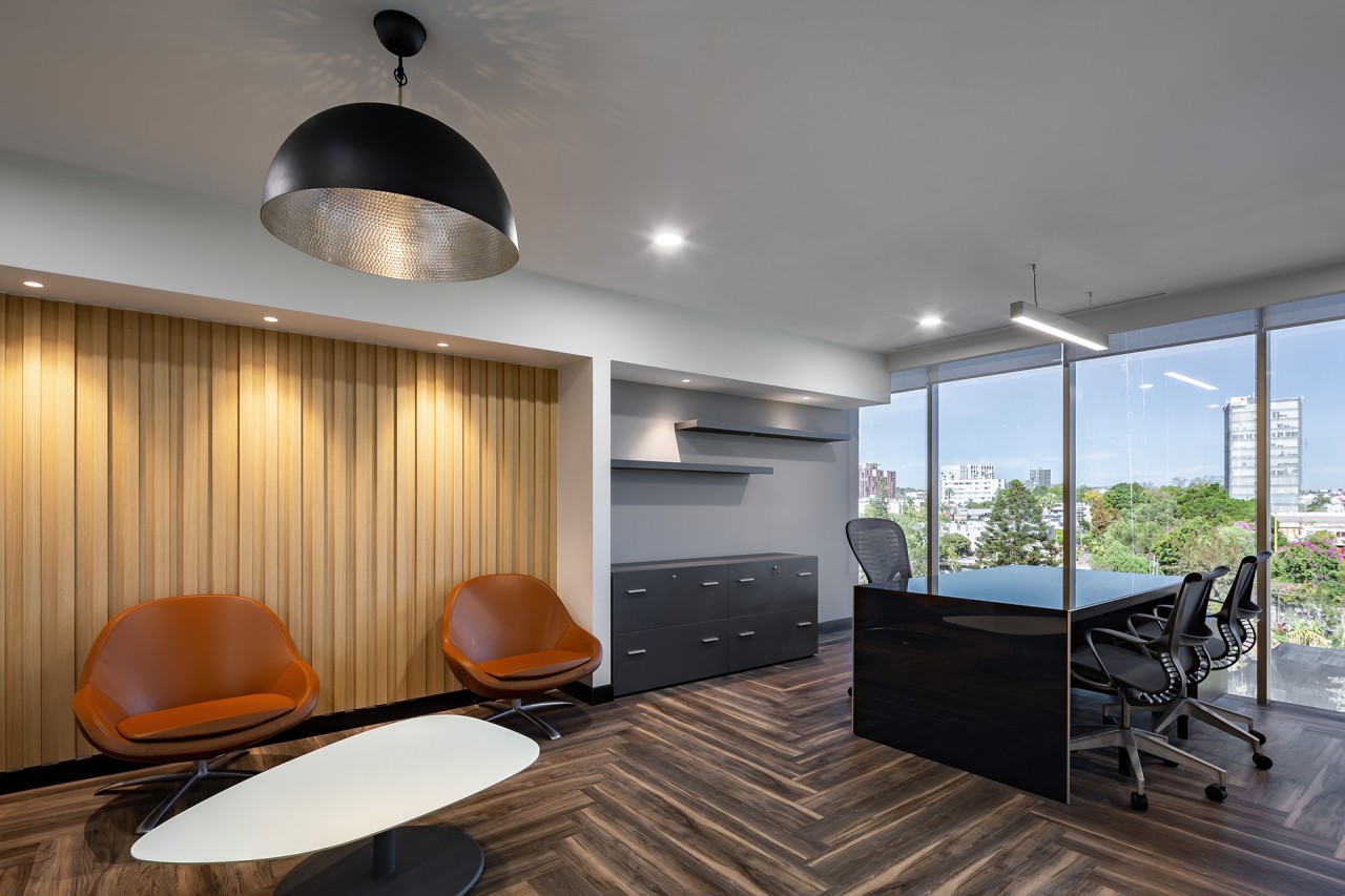 El proyecto fue conformado por la remodelación de un área de 220 m2 , el objetivo de diseño fue incorporar el estilo conservador del cliente y darle un ligero giro con la selección y aplicación de los materiales, de tal manera que pudiera sentirse identificado como tanto el cómo los demás usuarios. Esto se logró con la selección de tonos de manera aplicados en muros de remate visual combinados con texturas de concreto que balancean el concepto industrial y contrastan con los colores terracotas y grises que generan calidez.